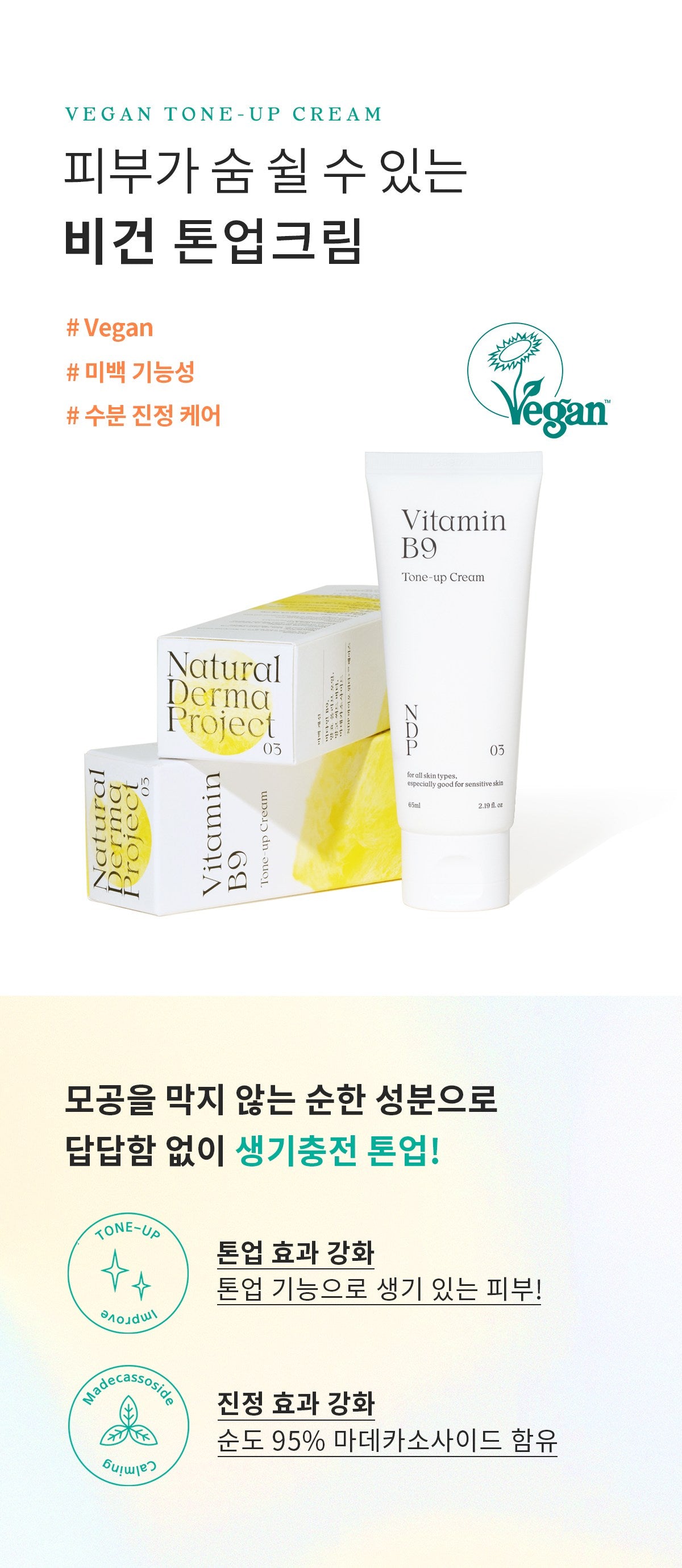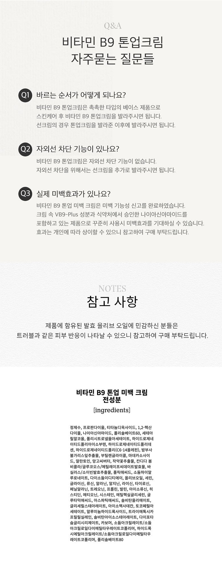 Does it have an actual whitening effect? Vitamin B9 Tone-up Whitening Cream has been reported for its whitening functionality. It contains the VB9-Plus ingredient and niacinamide approved by the Ministry of Food and Drug Safety, so you can expect a whitening effect with consistent use. The effect may differ depending on the individual, so please refer to it before purchasing.