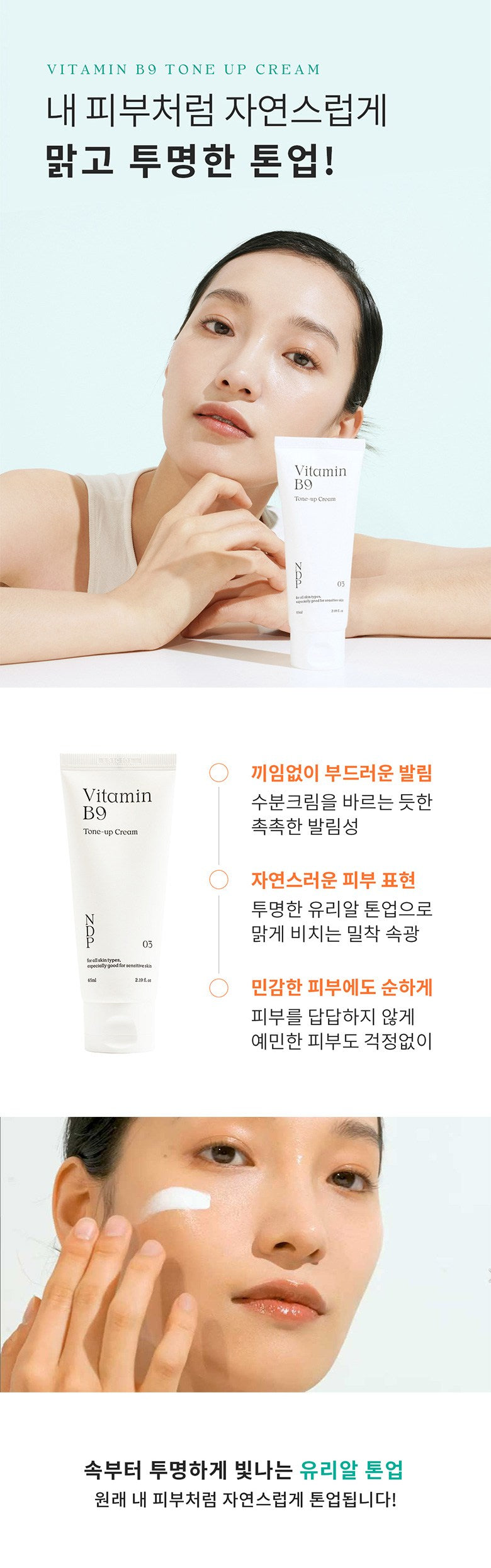 After finishing the basic skincare steps, lightly apply the cream as the last step and let it absorb. The cream adheres well without stiffness, perfect for creating naturally good skin. Note that Vitamin B9 Tone-up Cream is a day product, so it is recommended to wash your face before going to bed.