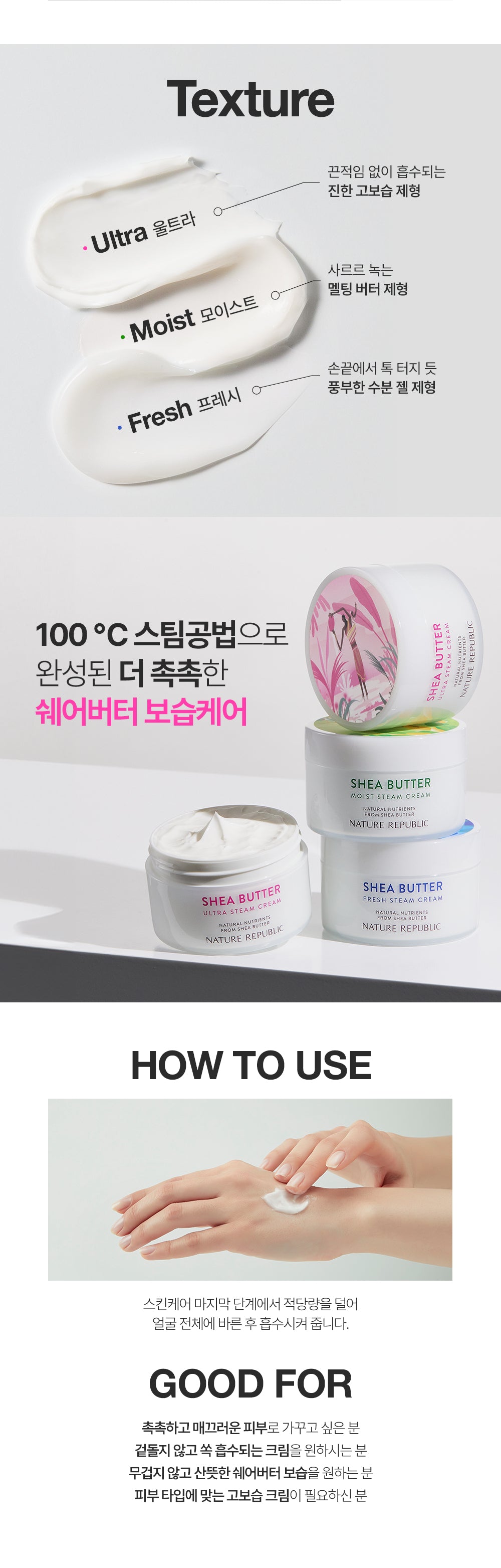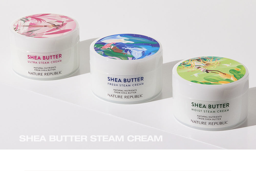 Nature Republic Shea Butter Steam Cream Ultra uses Steam Technology to fuse ingredients together resulting in a light cream that melts when it touches your skin. Steam Technology uses a blast of steam to extract the nutrients of each ingredient and fuse them together into a very light emulsion. The result is Steam Cream that melts when it touches your skin is faster absorbed into the skin than traditional creams. It also penetrates deeper than traditional creams, moisturizing skin up to 48 hours, making it a great Fall and Winter cream. Shea Butter Steam Cream Ultra fuses moisturizing butter extracted from nuts of the exotic African Shea Tree, Green Tea Seed Oil, and the antioxidant Maki Berry. Shea Butter is a rich source of the antioxidant Vitamin-A with numerous healing effects such as balancing skin tone and treating acne scars, sunburn or even insect bites and more. It also contains Vitamin-E providing deep moisturization while acting as an anti-free radical protecting skin against sun and environmental exposure. Green Tea Antioxidants preserve skin’s collagen and elastin reducing fine lines and wrinkles. As an Anti-Inflammatory, Green Tea Antioxidants calm and sooth skin, reducing excessive oil production, which reduces acne breakouts. Maki Berry is another great Antioxidant for your skin.