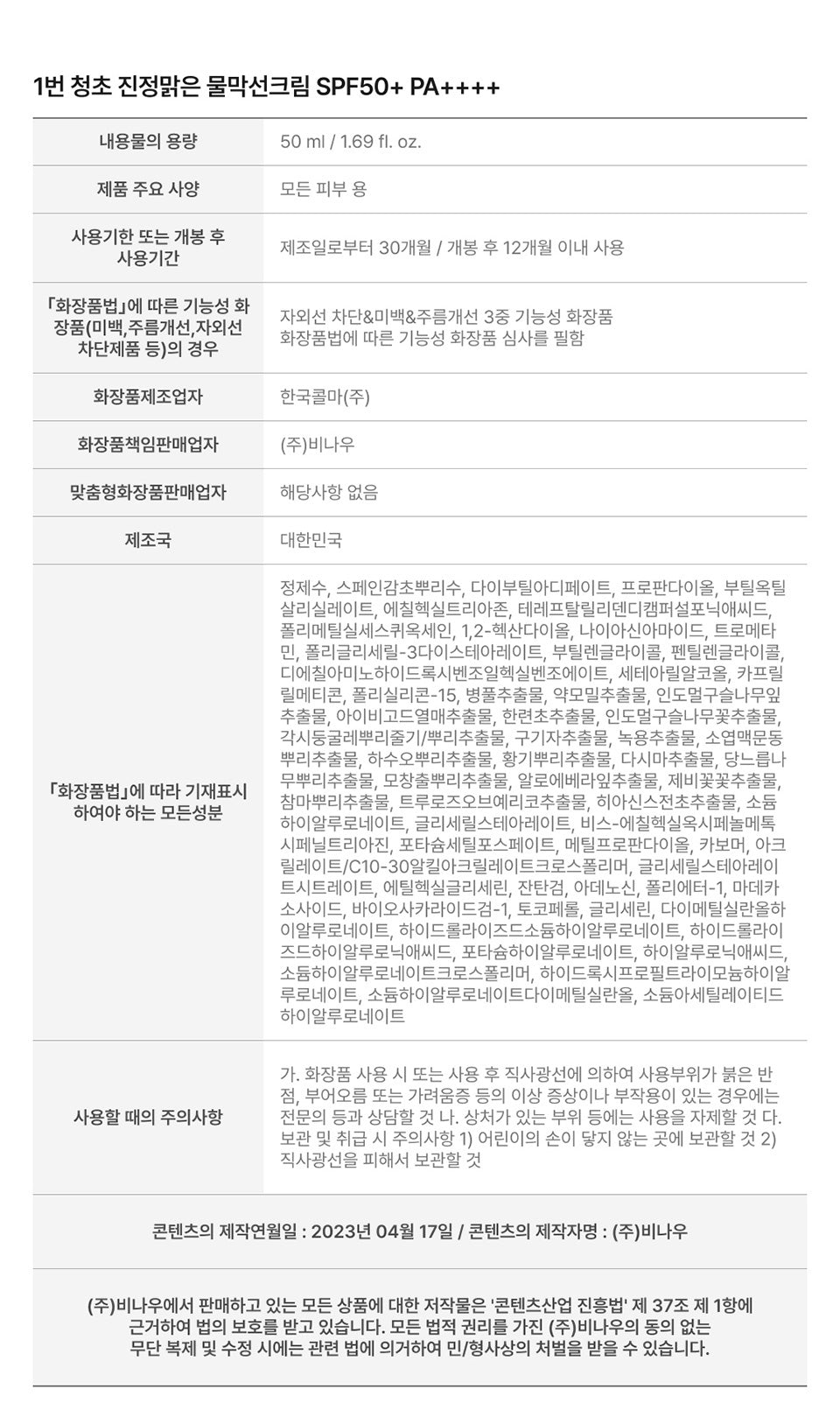 Discover the innovative numbuzin No. 1 Pure-full Calming Water Sunscreen, a 50ml formula that offers SPF50+ PA++++ protection while nurturing your skin with a 49.8% calming plant cream composition.