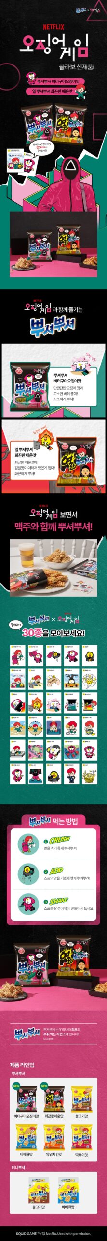 Get ready for a snacking experience like no other! PPusyeo PPusyeo collaborates with Netflix’s hit series Squid Game to bring you a fun, flavorful treat packed with excitement. Each pack includes a Squid Game-themed seal sticker (30 designs available).
