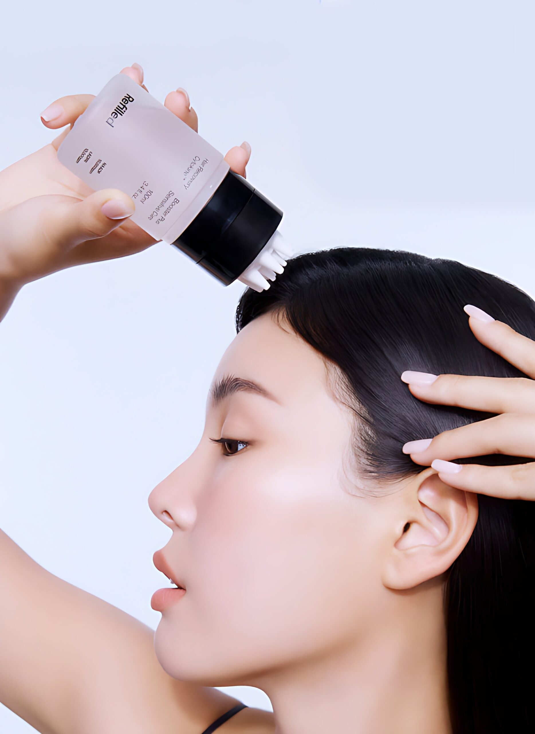 Applying the Refilled Cytokine Hair Tonic Booster Pro is simple and designed for direct, effective delivery to your scalp. The unique applicator allows for precise and mess-free application, as demonstrated in our product images.