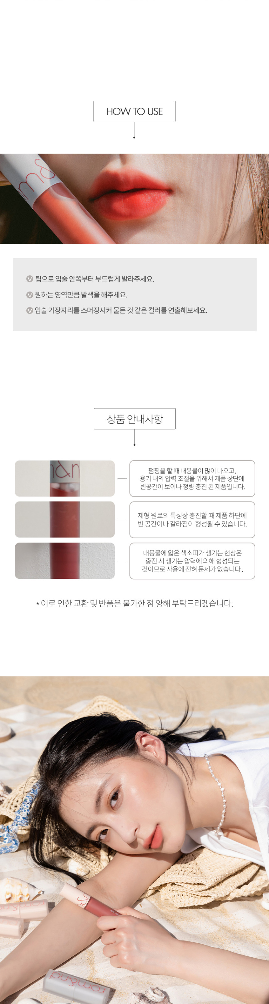 - Gentle Application: Using the soft applicator tip, gently apply a small amount of rom&nd lip tint to the inner part of your upper and lower lips.