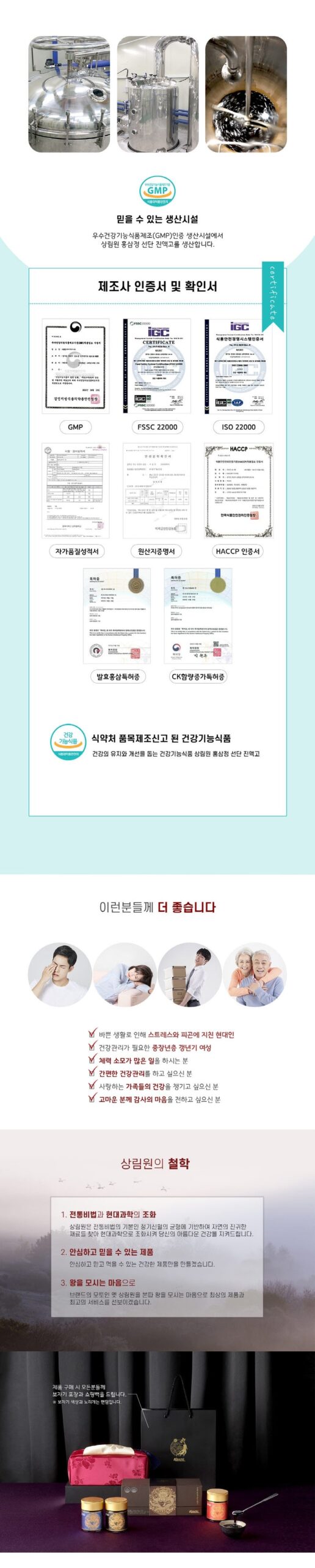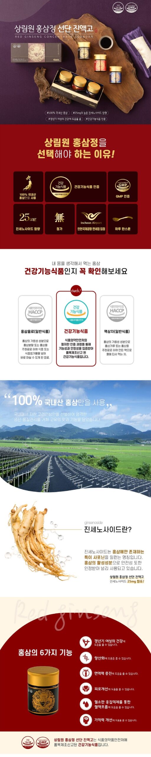 SANGLIMWON Hongsamjeong Seondan Jinyeokgo is a health-functional food that has passed rigorous certification and testing by the Korea Ministry of Food and Drug Safety (MFDS). This ensures that the product meets the highest standards for functionality, safety, and quality.