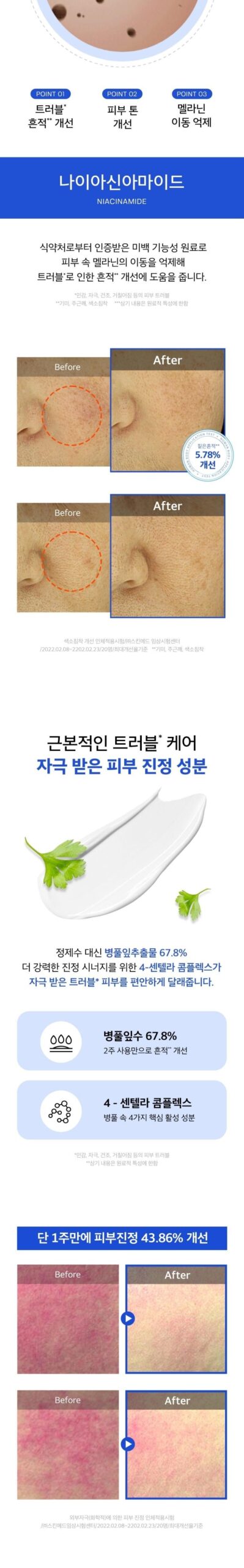 - Centella Asiatica Leaf Extract: Used at a concentration of 67.8%, replacing purified water for enhanced soothing effects.