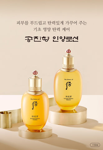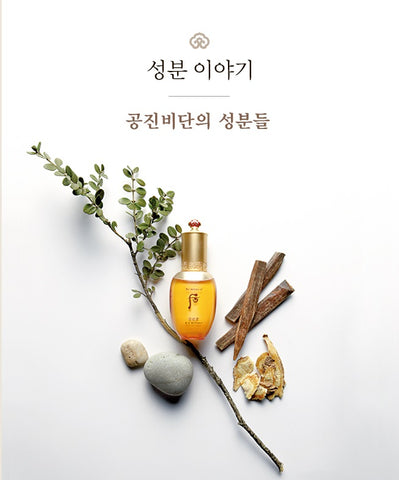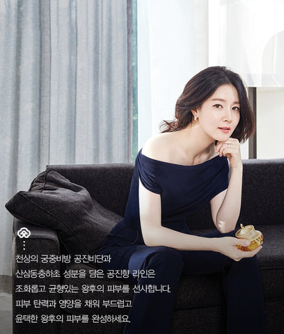 The Gongjinhyang line, which contains ingredients from the heavenly royal palace secret GongJinBiDan and wild ginseng wormwood, provides a harmonious and well-balanced skin tone.