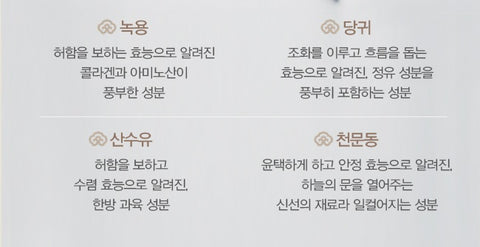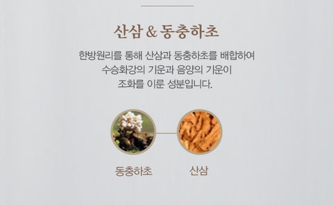 It is an ingredient that harmonizes the energy of Suseunghwagang and the energy of yin and yang by blending wild ginseng and cordyceps through oriental medicine principles.