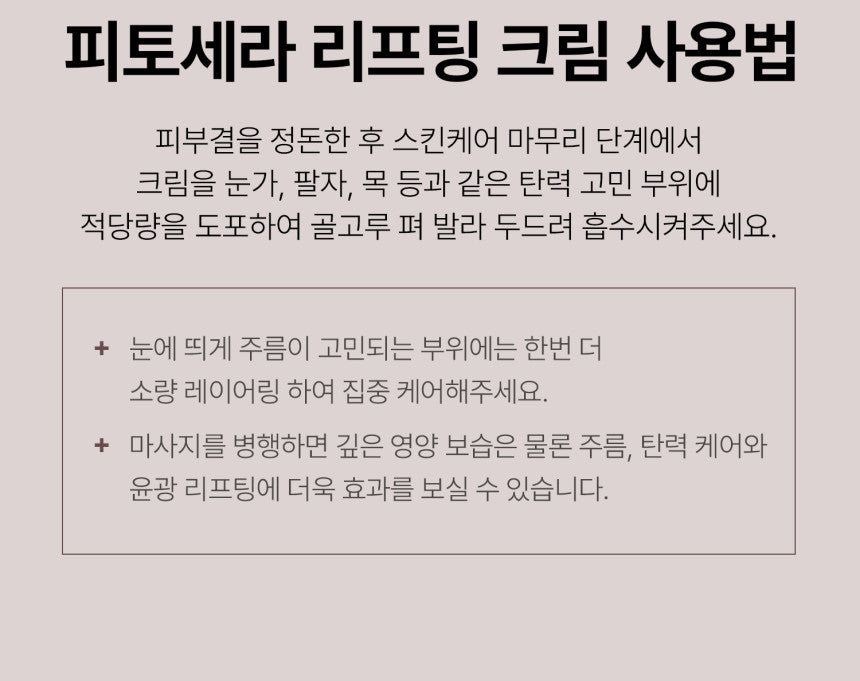 - Apply an appropriate amount to areas prone to wrinkles and sagging, such as the eyes, smile lines, and neck.