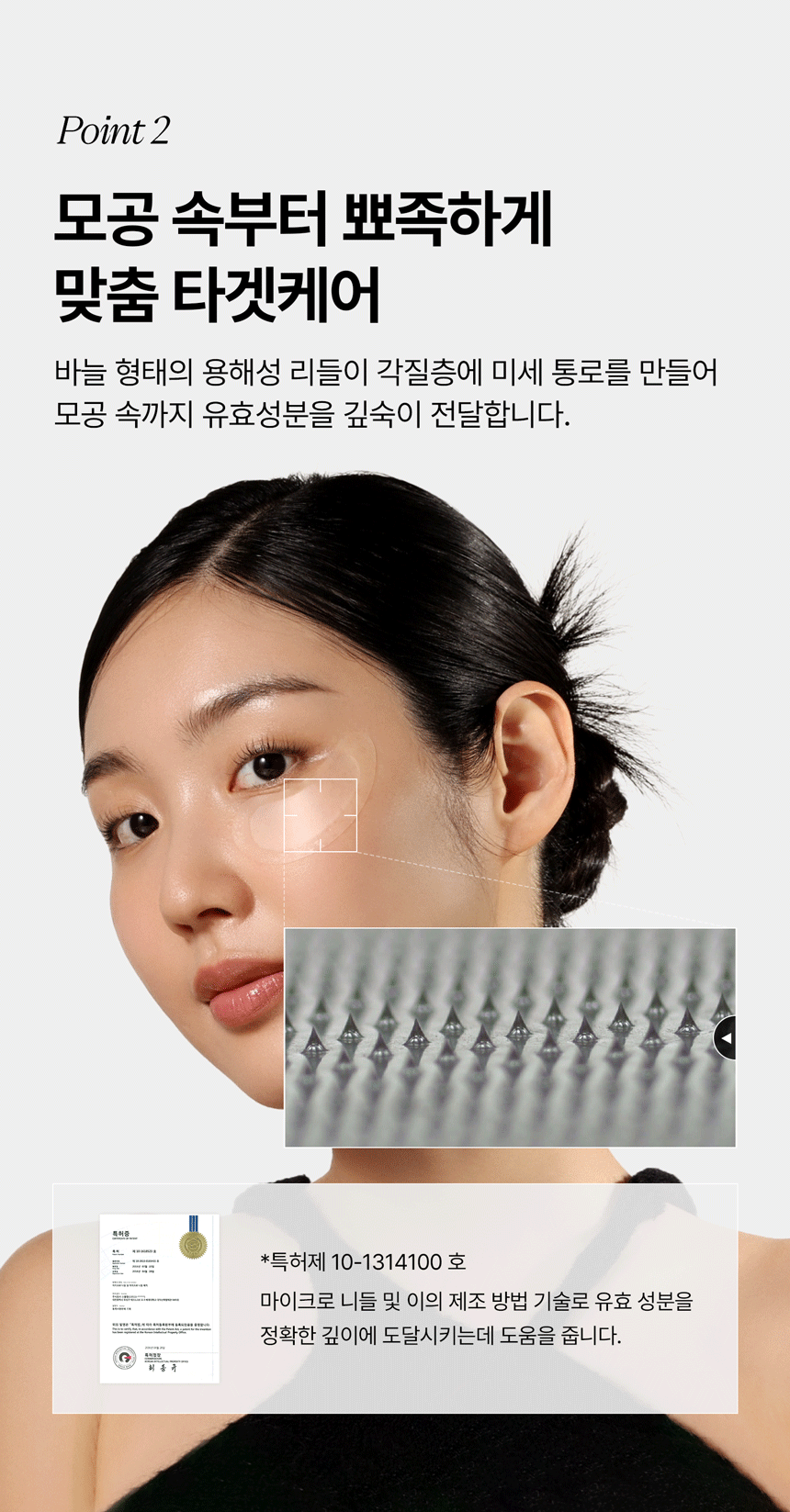 - Patent-protected needle-shaped soluble leads create microscopic channels in the skin to deliver active ingredients deep into the pores. (Patent No. 10-1314100)