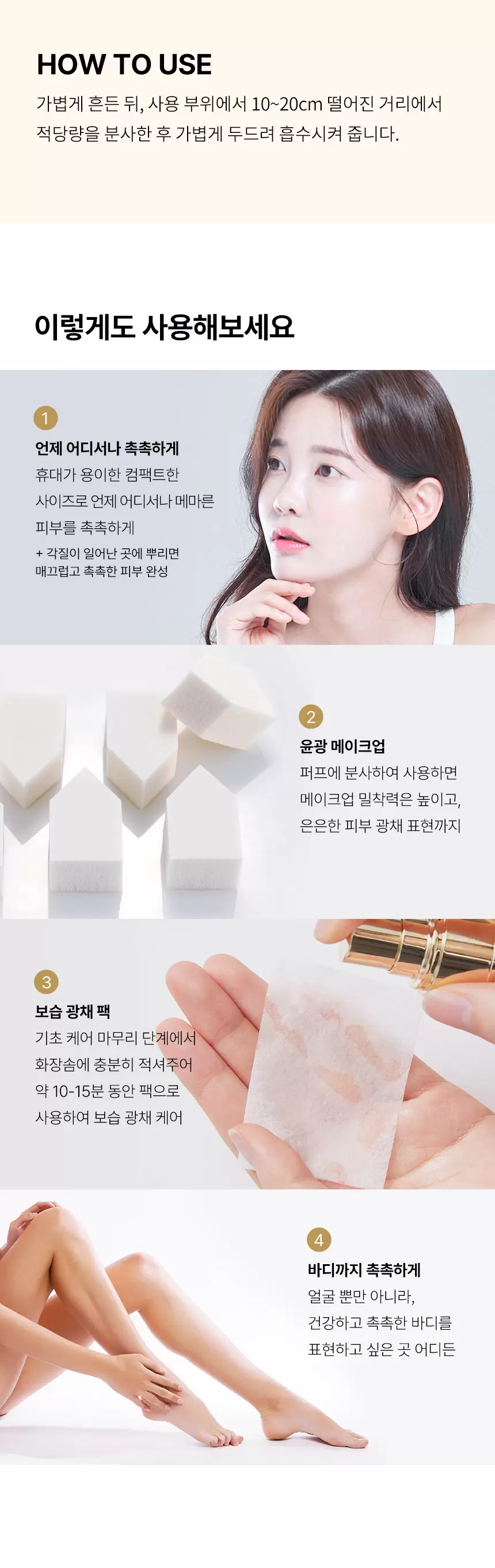 - Glowing Makeup Booster: For a flawless, radiant finish, lightly spray the mist onto your makeup puff before application. Your makeup will adhere better, and you’ll achieve a subtle, luminous glow.