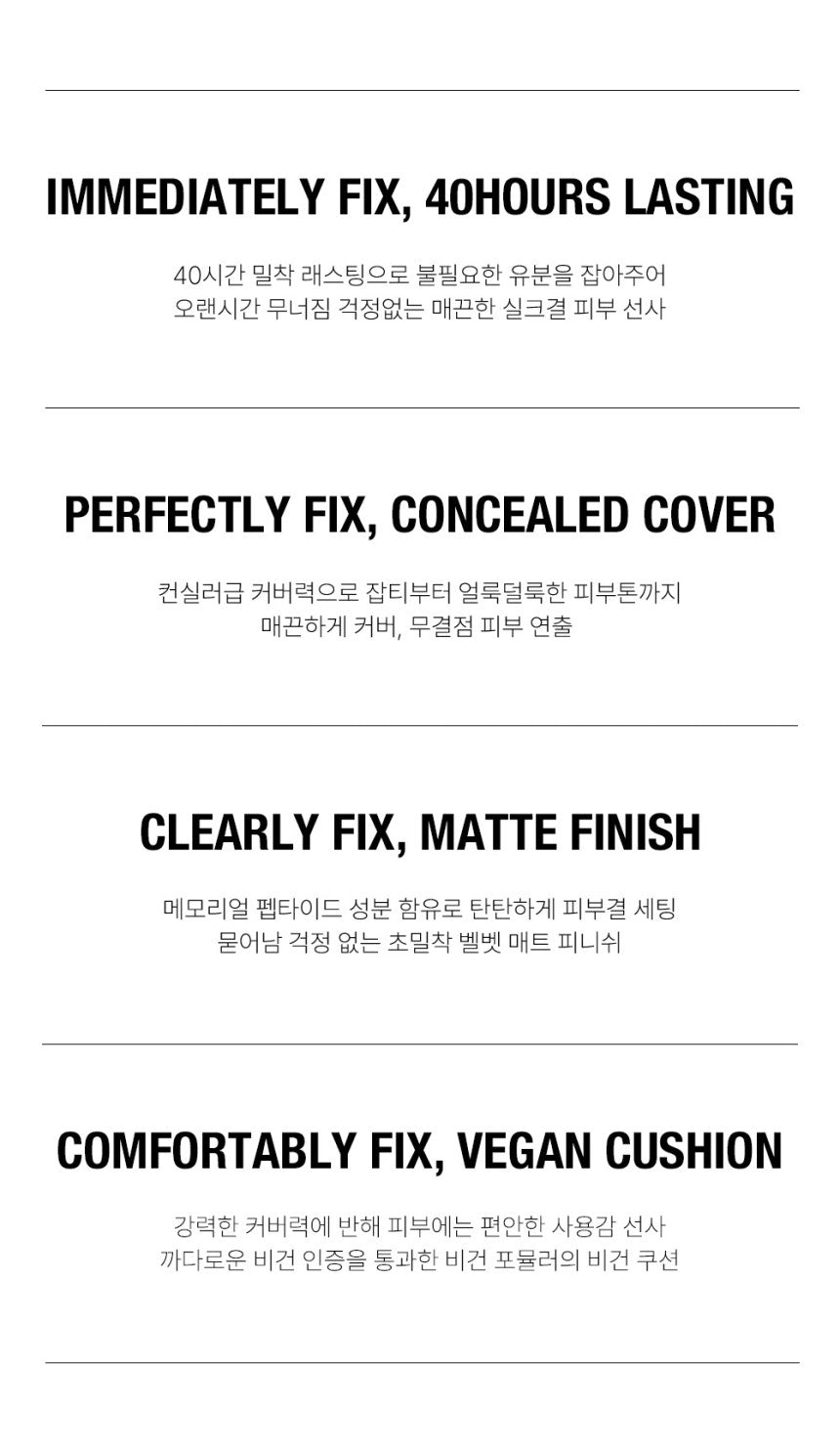 The Fixing Cover Cushion utilizes covering powder particles of various sizes to achieve a perfect cover, from redness to deep spots, resulting in a smoother, more flawless skin appearance. It meticulously adheres to every nook and cranny, including pores and uneven textures, to even out skin tone and texture for a smooth, matte finish that feels like your own skin.