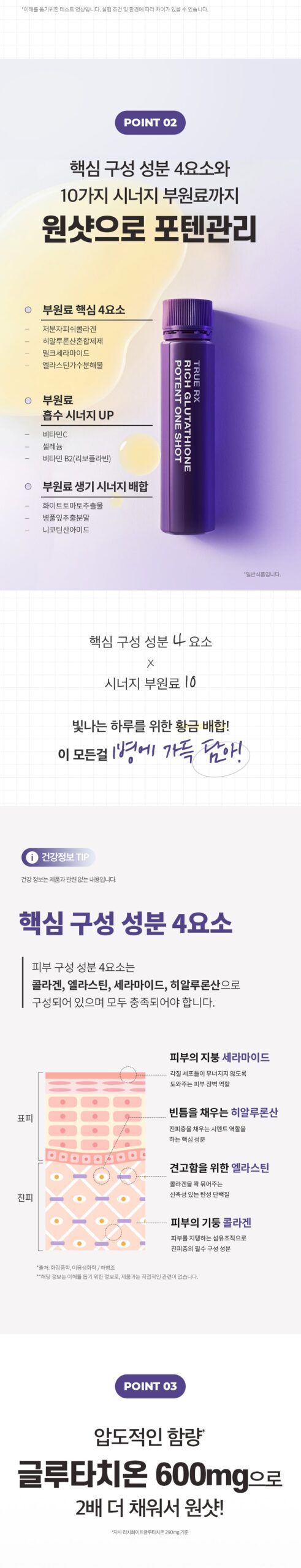 Take one bottle a day to support your daily routine and enjoy the delicious, juice-like flavor. Keep your potential at its peak with TRUE RX Rich Glutathione Potent One Shot.