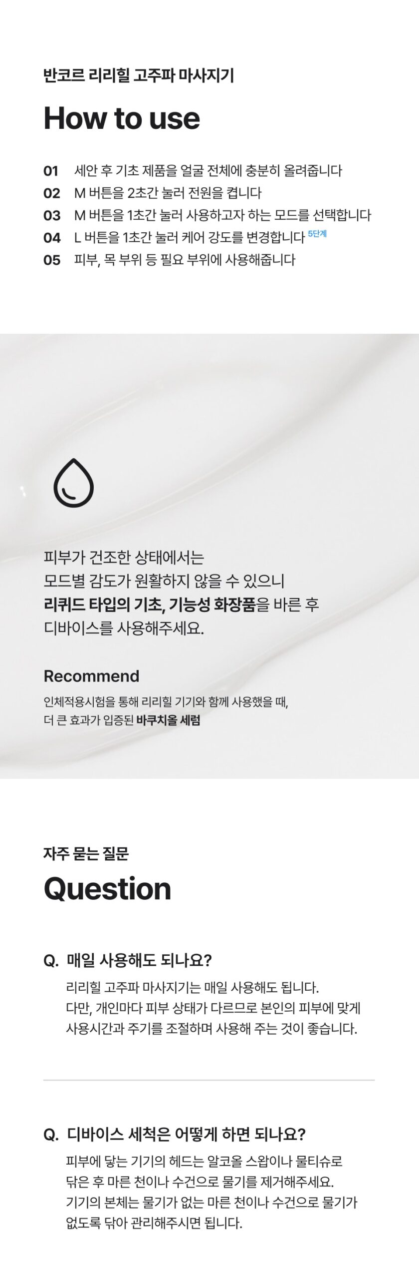 Use the device after applying liquid type basic or functional cosmetics.* Recommand