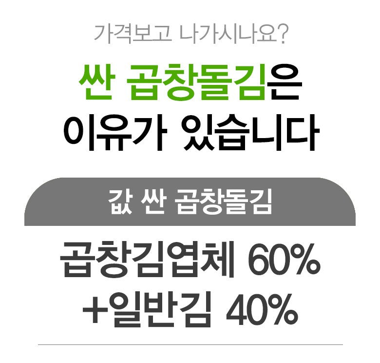 Many seaweed products mix regular seaweed with gopchang seaweed to cut costs, but Geumbok’s Wando Gopchang Dolkim is 100% pure gopchang seaweed with no blends or fillers.