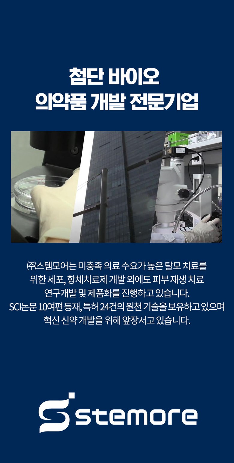 Stemmore Co., Ltd. is conducting R&D and commercialization of skin regeneration treatment in addition to developing cell and antibody treatments for hair loss treatment, which has a high unmet medical demand. About 10 SCI papers have been registered and 24 patents have original technology, and we are taking the lead in developing innovative new drugs.