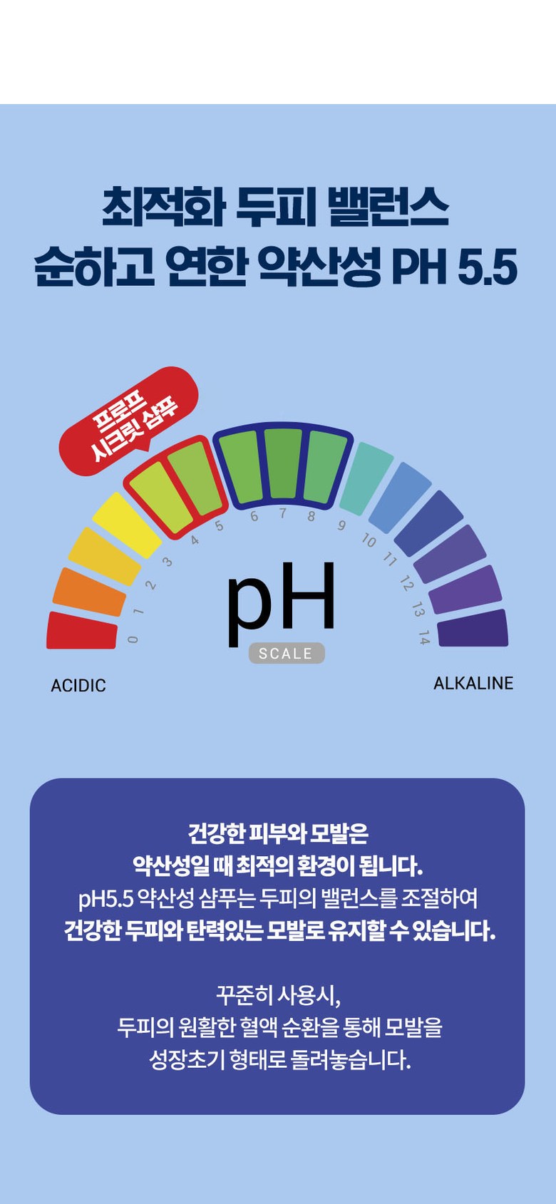 Healthy skin and hair are in an optimal environment when they are slightly acidic. pH 5.5 weakly acidic shampoo adjusts the balance of the scalp to maintain a healthy scalp and elastic hair.