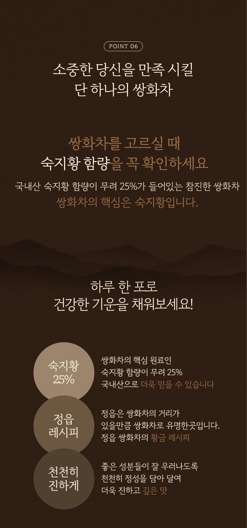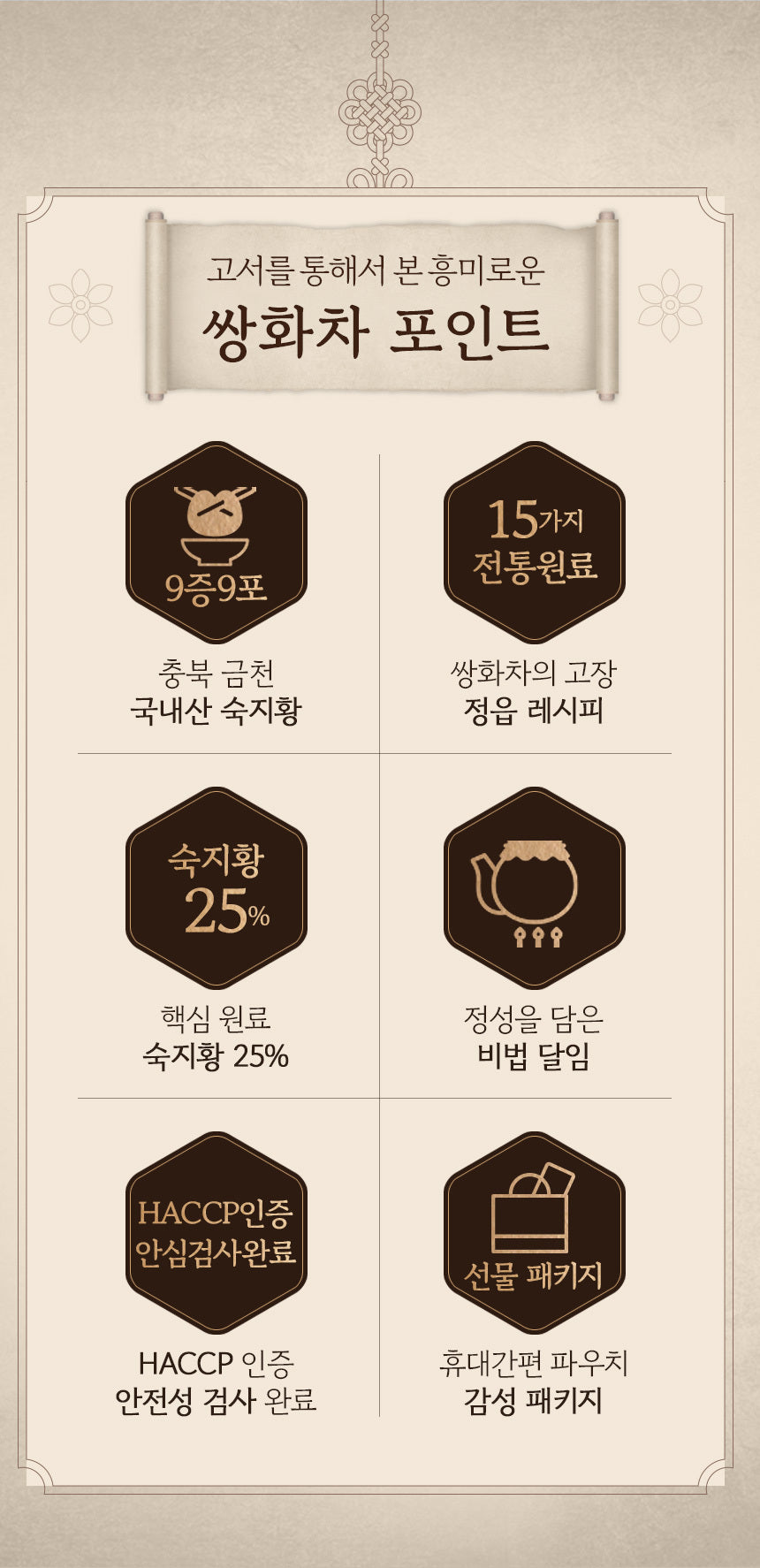 This Ssanghwacha is brewed using a golden ratio of medicinal herbs, ensuring depth of flavor and rich aroma.