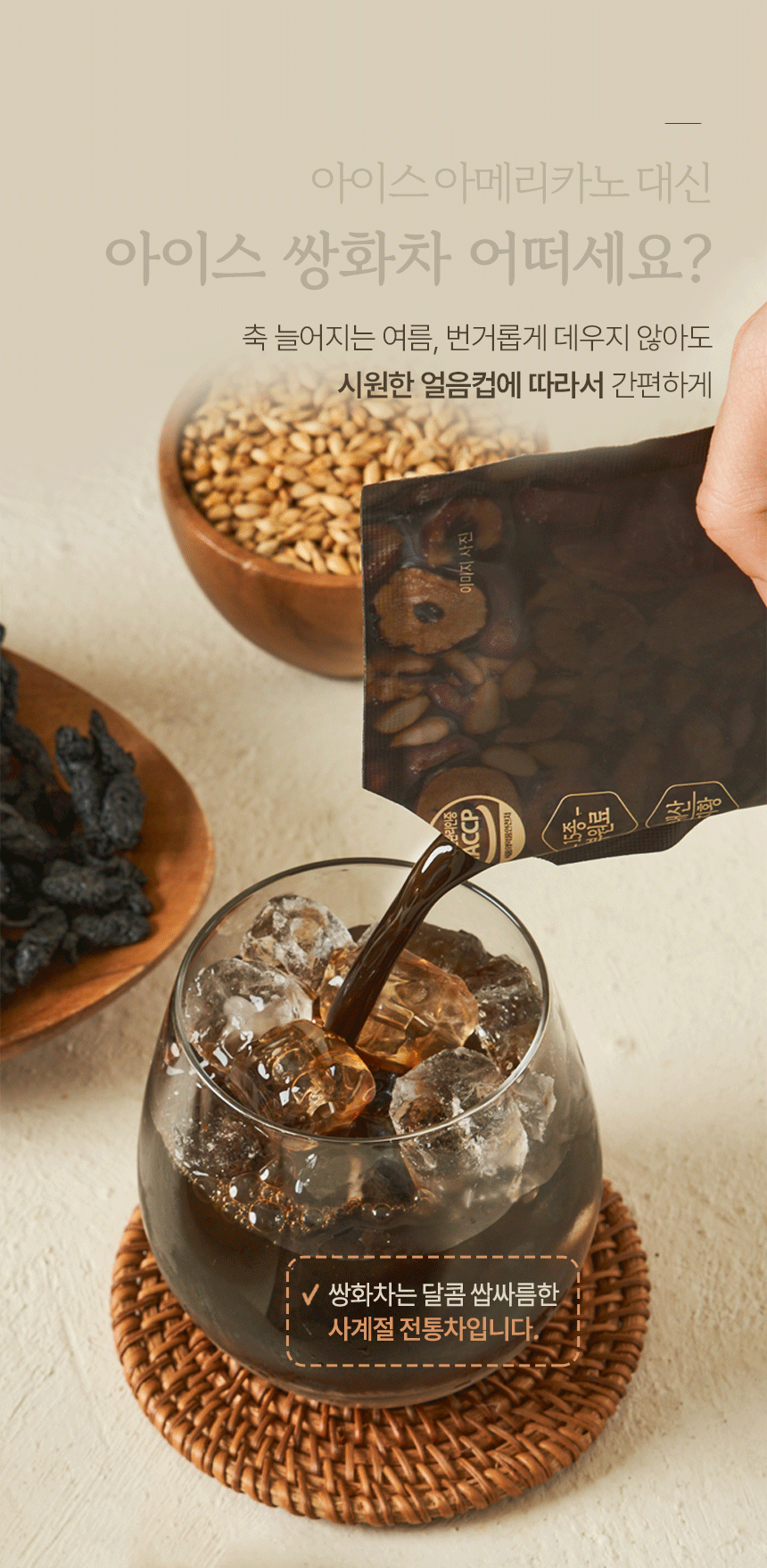 - Pour over ice for a refreshing Iced Ssanghwacha.