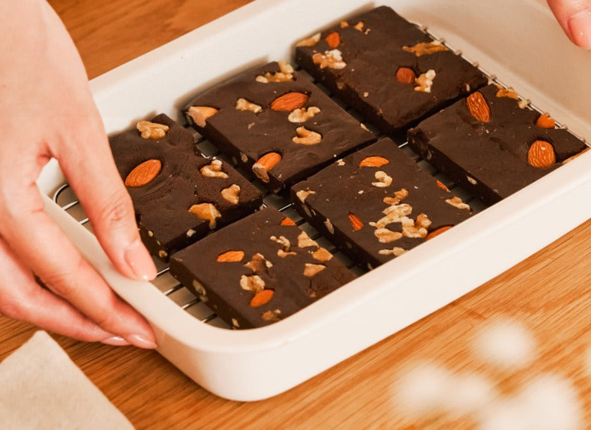 Enjoy the delightful taste of a brownie with the added benefit of a healthy snack. The protein bar is topped with nuts, providing a satisfying and crunchy texture.
