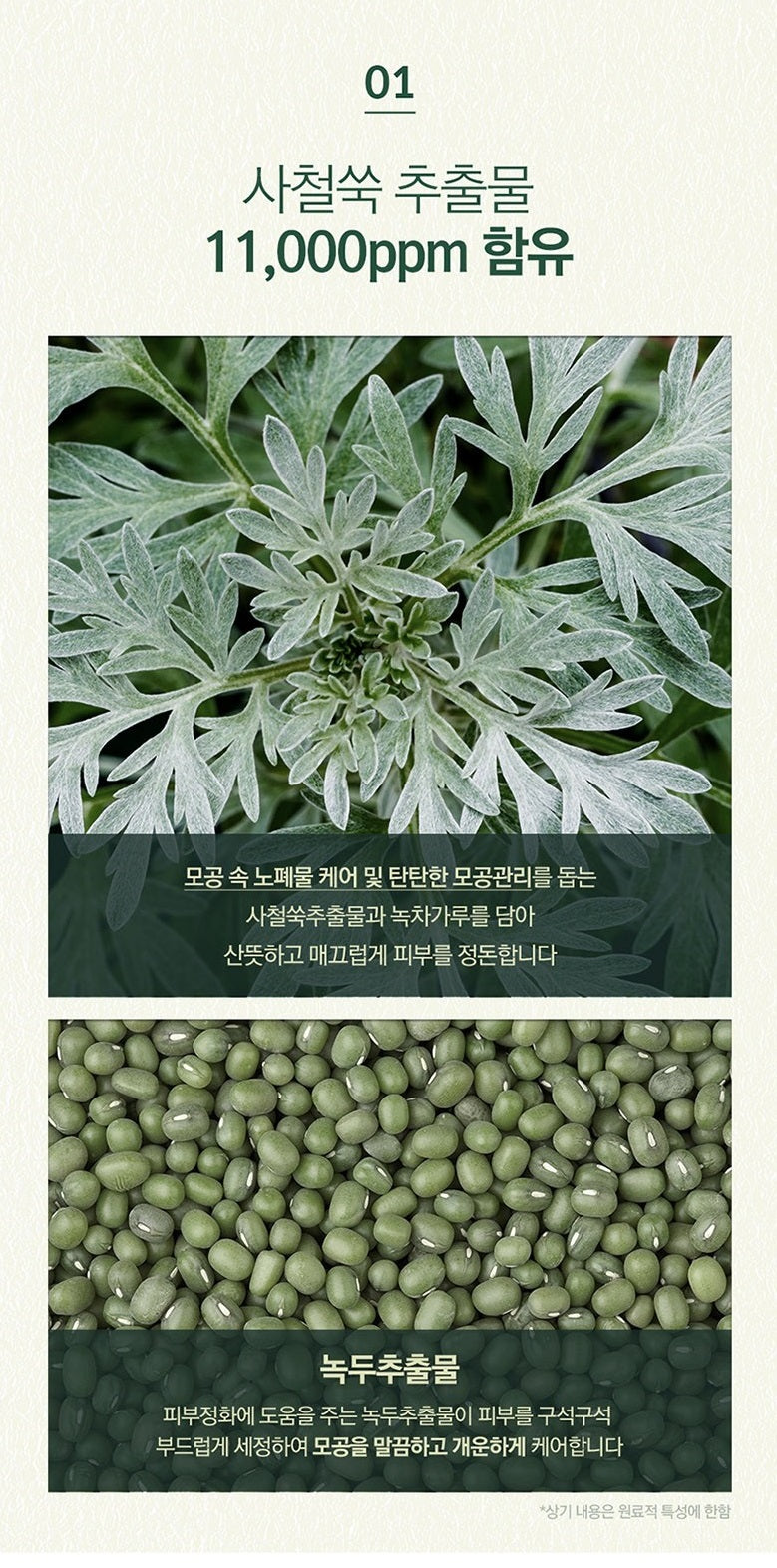 Artemisia extract takes care of waste and sebum, and healthy green tea powder helps tighten pores and gives you fresh and clean skin.