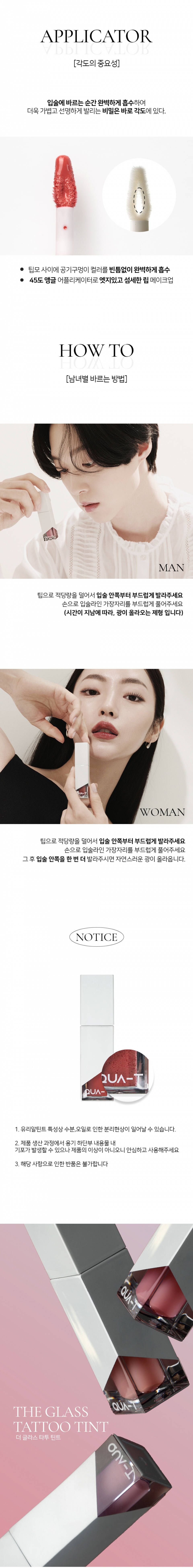 For an even more intense glass-like shine and prolonged wear, apply one layer of QUA-T The Glass Tattoo Tint, blot gently, and then apply a second layer. This layering technique helps build color intensity and enhances the glossy effect, leaving you with perfectly plump and radiant lips.