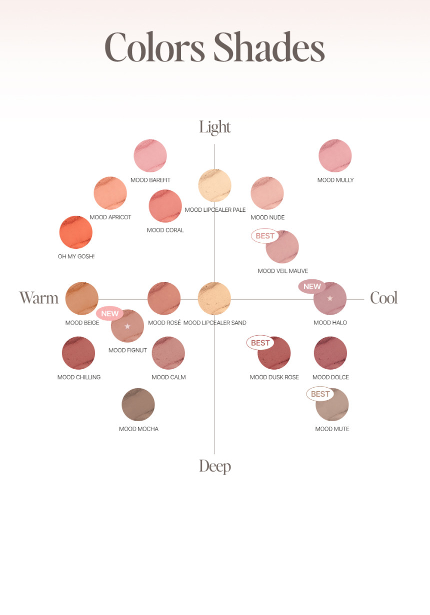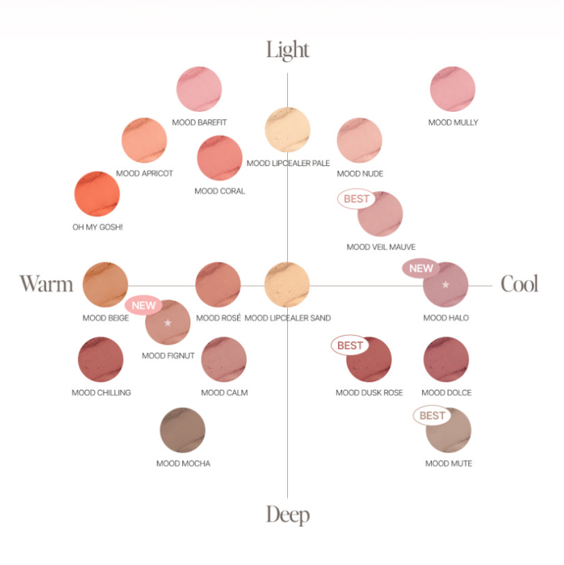 Navigate our expertly curated palette to find the QUATI My Mood Velvet Lipstick shade that speaks to you. Whether you prefer light, airy tones or deep, intense colors, and whether your skin has warm or cool undertones, our diverse selection ensures a perfect match for every mood and complexion.