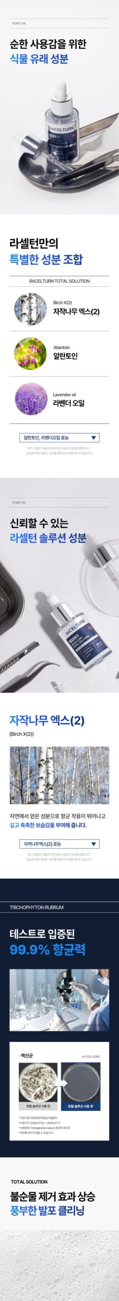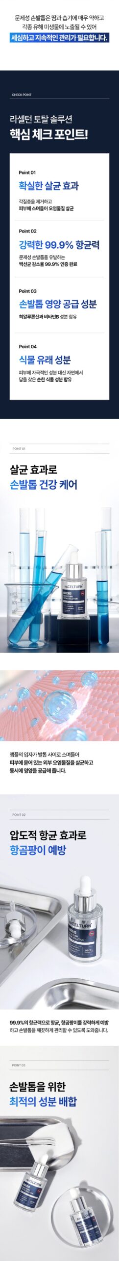 RACELTURN Total Solution addresses nail issues caused by excessive moisture, fungal exposure, and harmful microbes. Its unique formulation nourishes and protects nails, making it a reliable long-term solution.