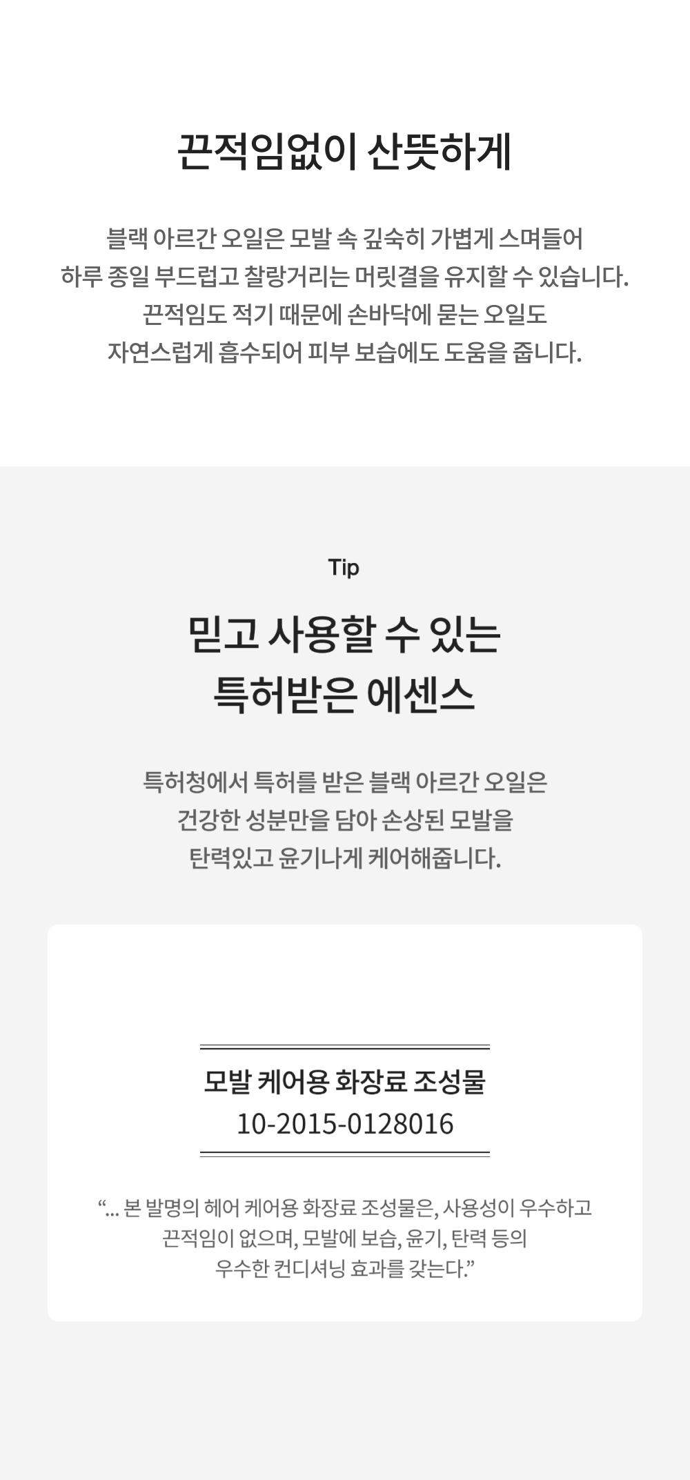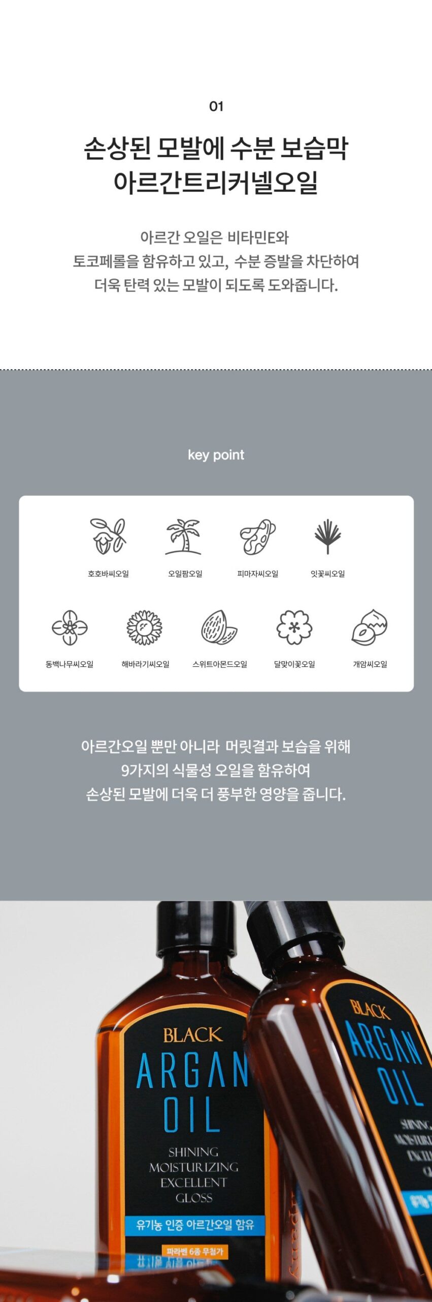 Black argan oil lightly permeates deep into the hair to keep it soft and shiny all day long.