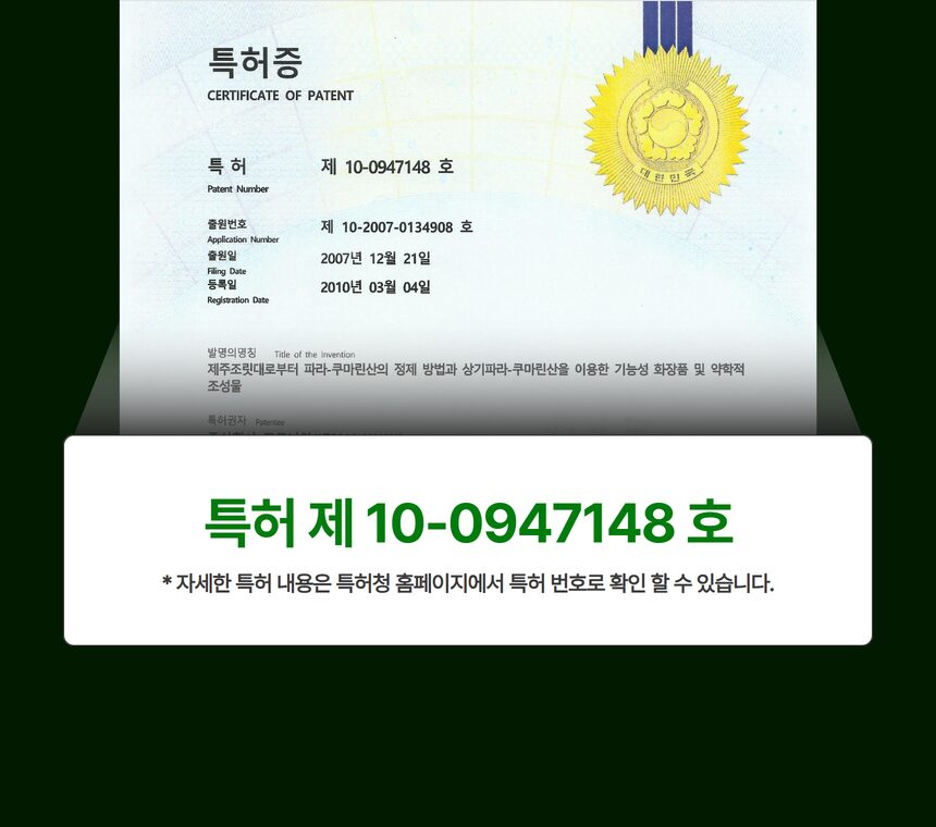 - Jeju Sasa Quelpaertensis Nakai Extract (Patented – Patent 10-0947148): Strengthens skin resistance and boosts hydration.