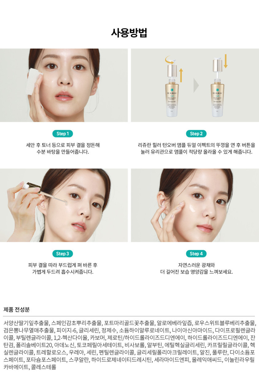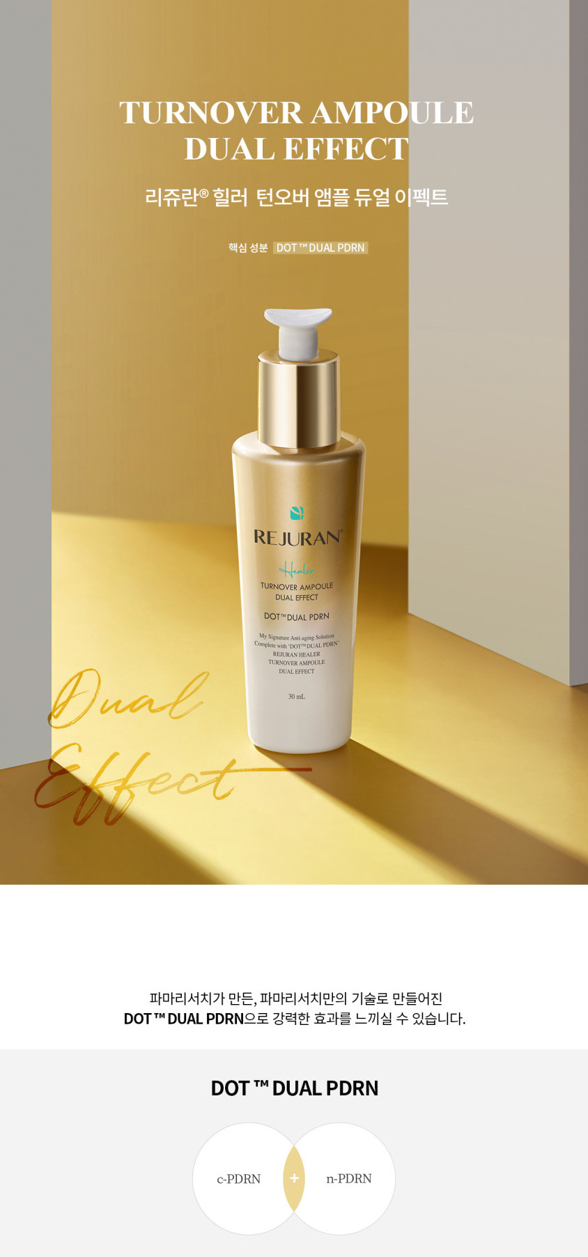 The REJURAN Turn Over Ampoule Dual Effector is an advanced dual-bottle treatment system featuring proprietary DOT DUAL PDRN technology. This luxurious gold-packaged set delivers concentrated rejuvenation through two synergistic formulas that work together to accelerate skin turnover and renewal.