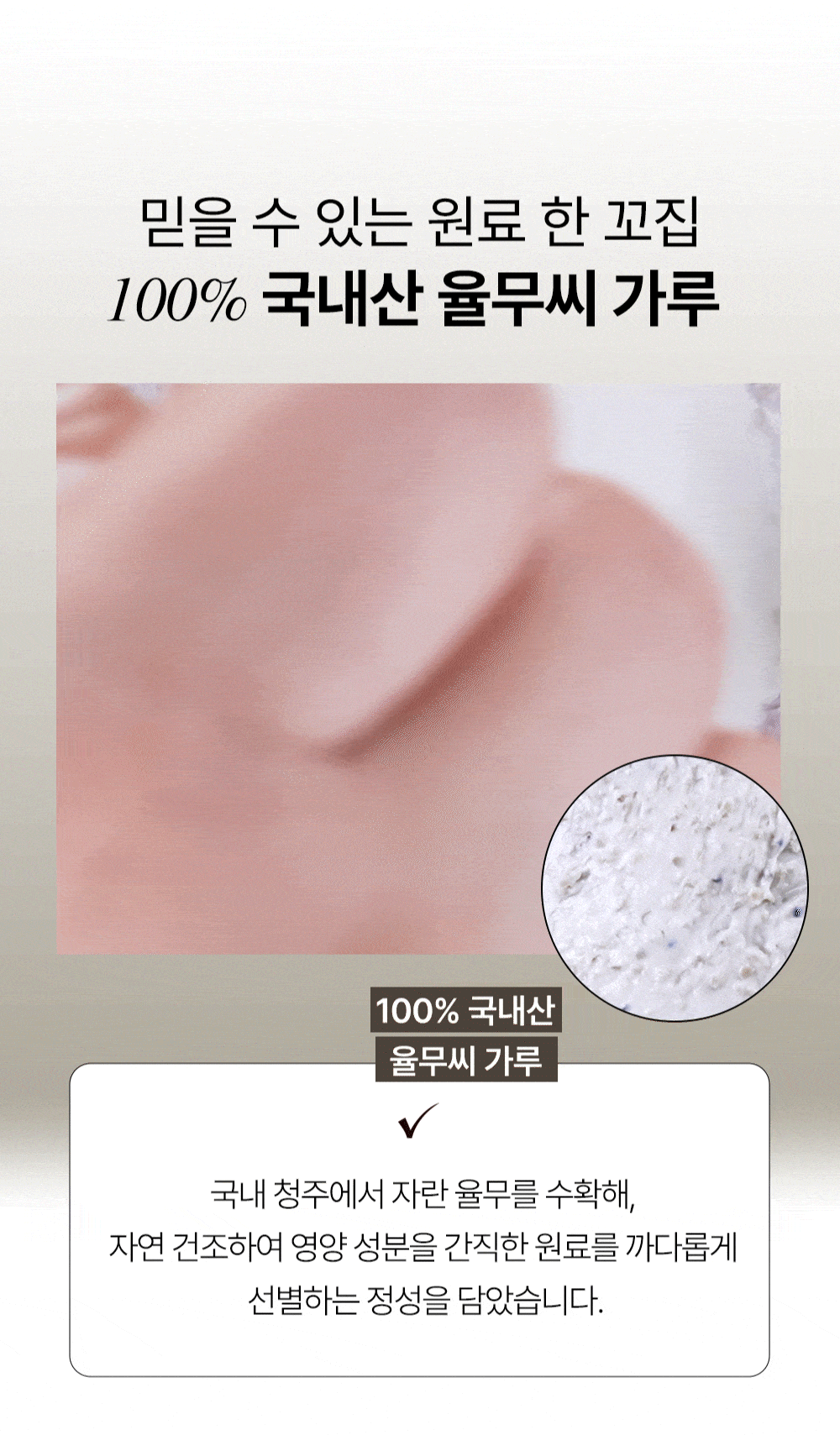 Our 100% domestic yulmu seed powder is sourced from Cheongju, Korea. Grown naturally and ground using a traditional millstone-inspired method, this premium ingredient: