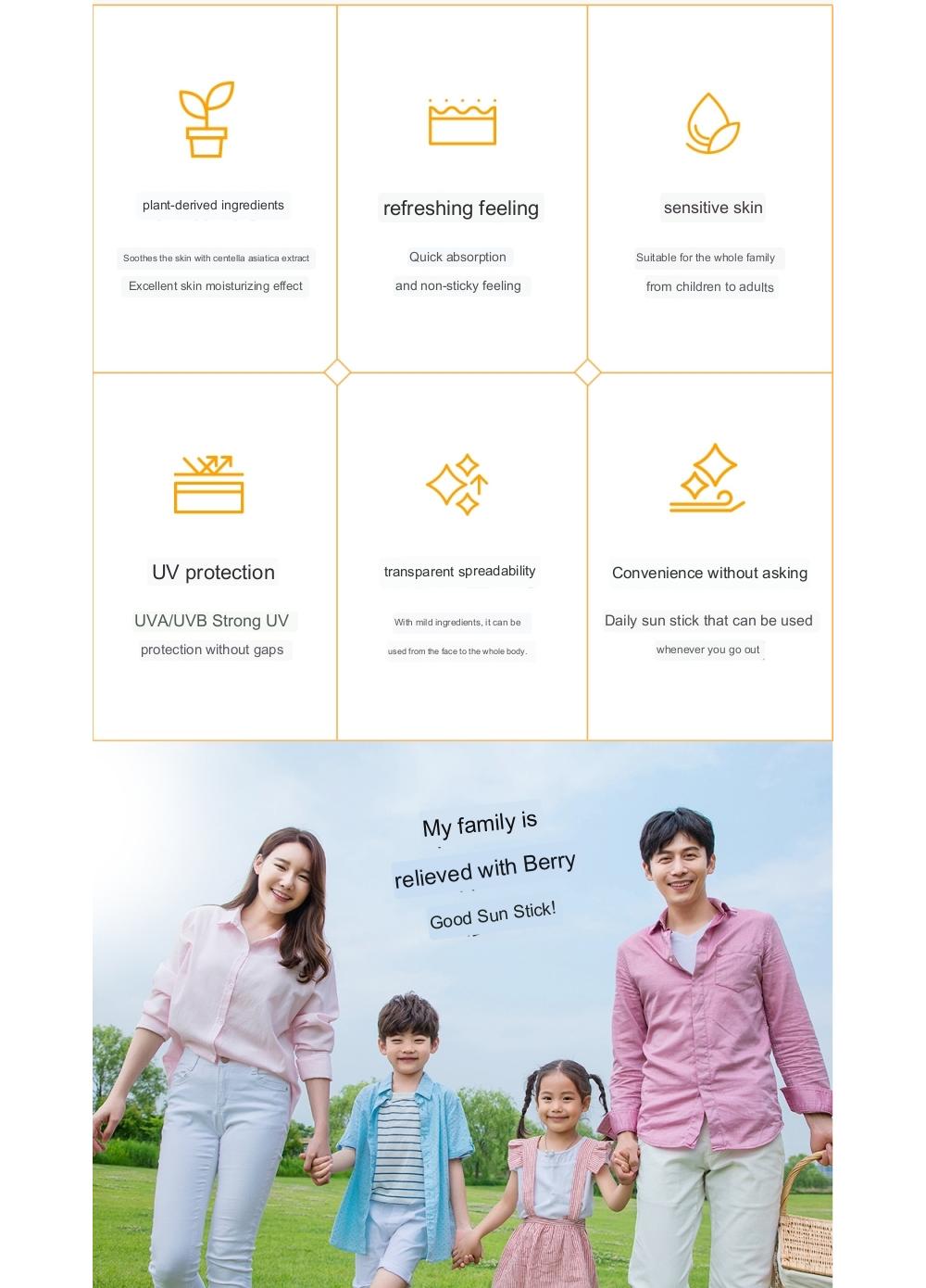 Even for sensitive skin, our sun stick provides safe UV protection with its mild ingredients. Rokkiss Berry Good Sun Stick is user-friendly and does not stick to your hands, making it a non-sticky, convenient sun product for the whole family.