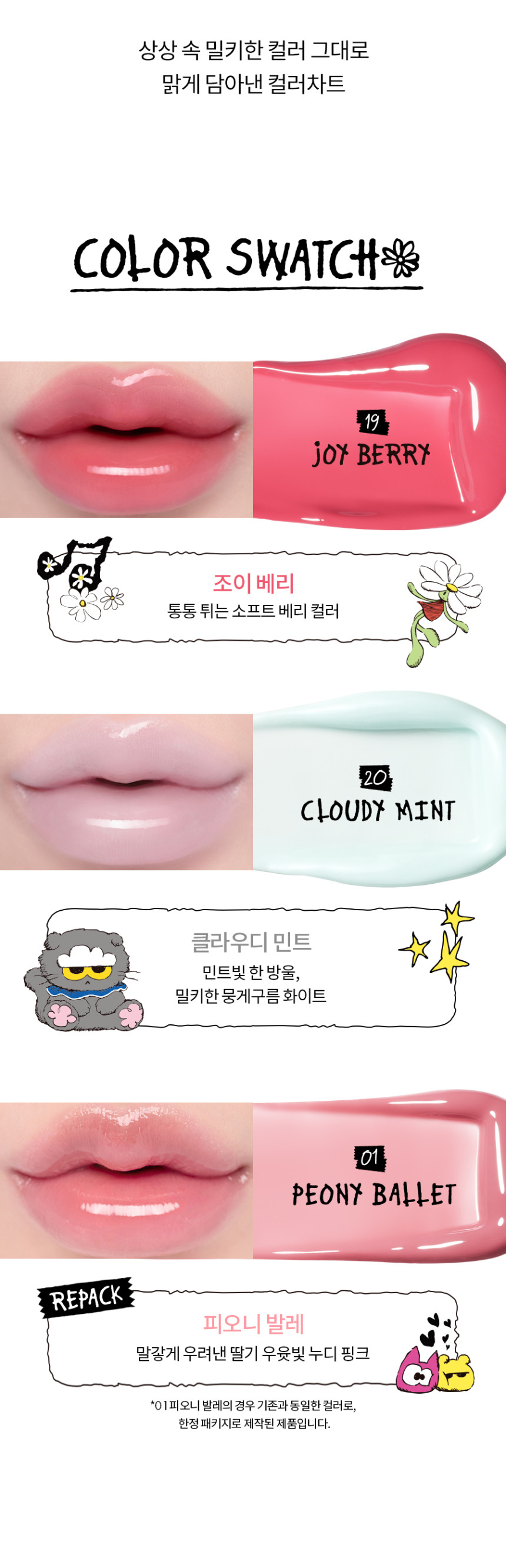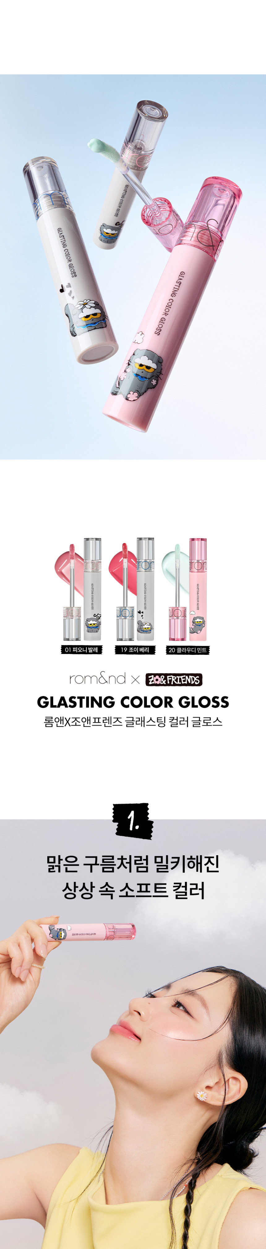 ROM&ND x Joanne Friends Glasting Color Gloss delivers high-shine, glassy lips in cute limited edition packaging featuring adorable sheep characters. This glossy formula provides vibrant color with a non-sticky, comfortable wear.