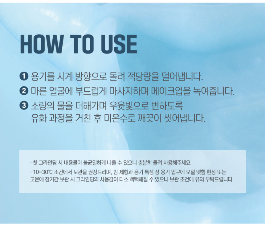- Gently massage in circular motions to effectively dissolve makeup, sunscreen, and impurities.