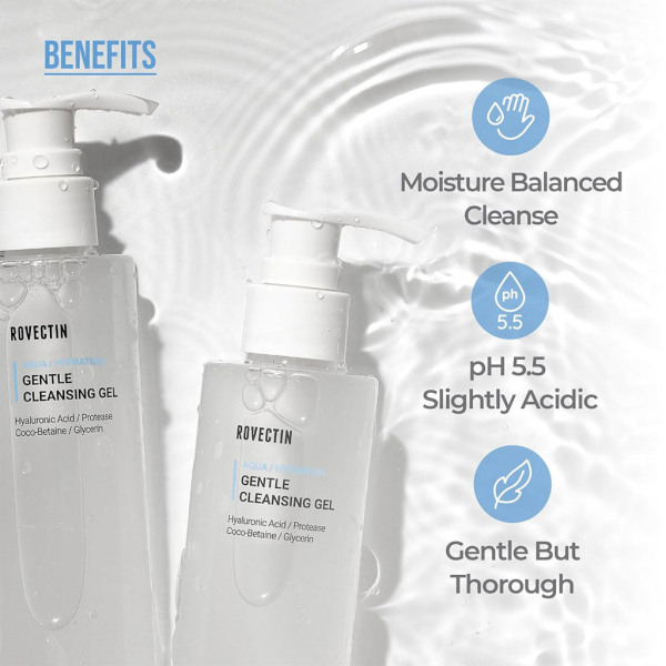 The Rovectin Aqua Hydration Gentle Cleansing Gel (Conditioning Cleanser) is a gentle, low-pH, hydrating cleanser that cleanses away daily grimes without irritating or stripping your skin of its protective moisture barrier. Formulated with 8 types of Hyaluronic Acid, Glycerin and Protease to keep skin hydrated, smooth and toned. This mild yet powerful formula removes dirt and dead skin cells while maintaining the skin’s moisture level so you won’t feel that tight feeling even after cleansing!