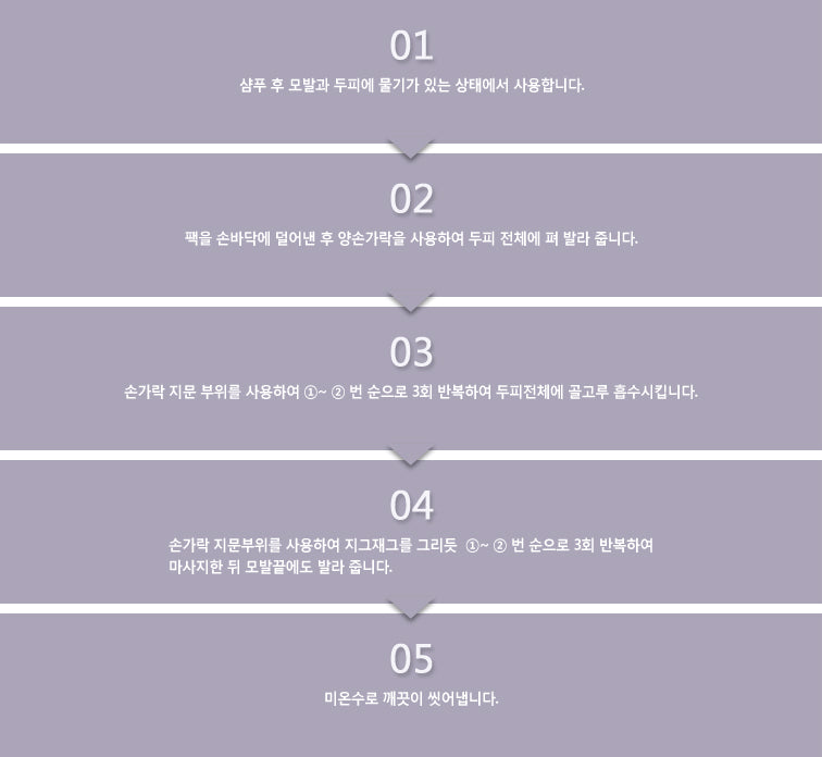 03. Repeat 3 times in the order of 01~02 using the finger print area to absorb evenly throughout the scalp.