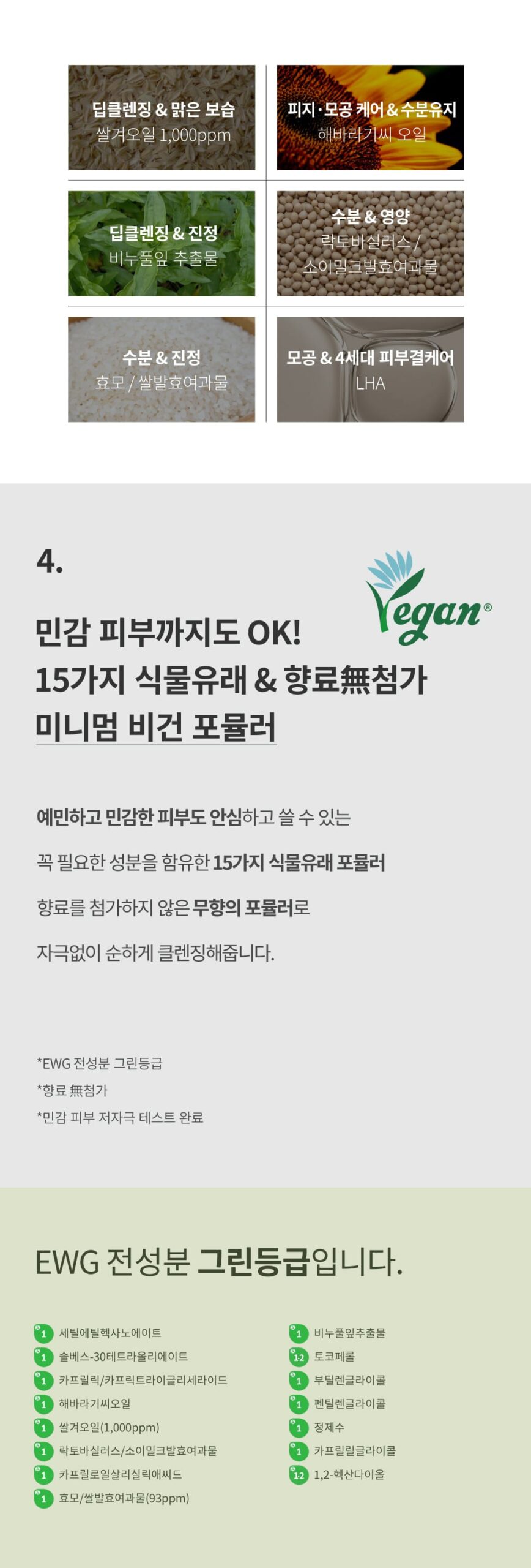 Formulated with 15 plant-derived ingredients, free from added fragrances, and presenting a minimum vegan formula. All ingredients are of EWG GREEN grade, ensuring a safe and gentle experience for sensitive skin.