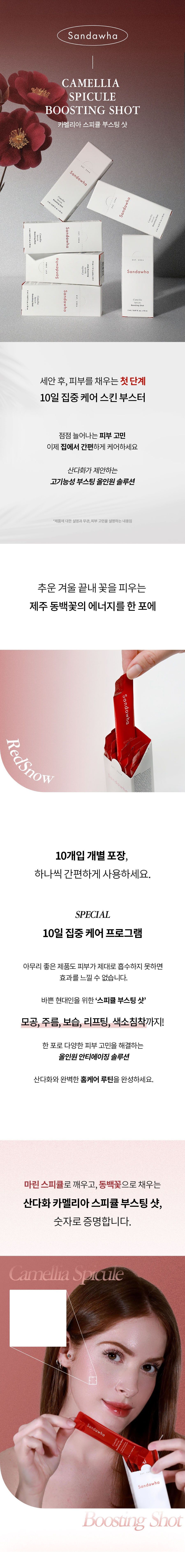 The SANDAWHA Camellia Spicule Boosting Shot is a powerful yet gentle functional cosmetic. It contains a comprehensive blend of effective ingredients specifically chosen to address various skin concerns, promoting both elasticity and firmness.