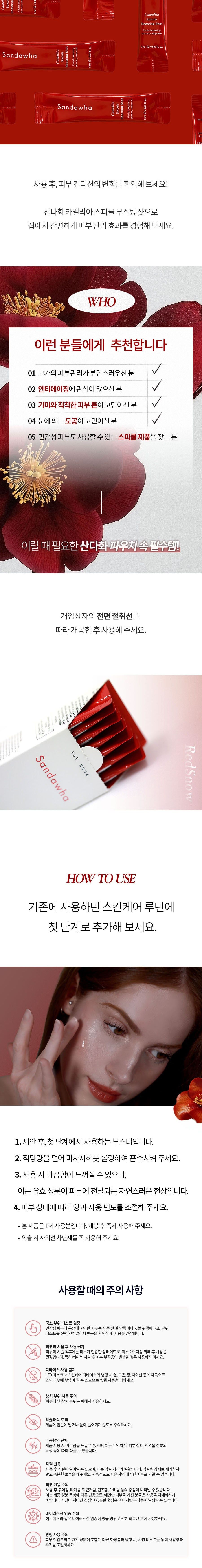 Confirm the visible difference in your skin condition after consistent use! Experience the transformative power of the Sandawha Camellia Spicule Boosting Shot in the comfort of your home, designed to be effective yet gentle on the skin.