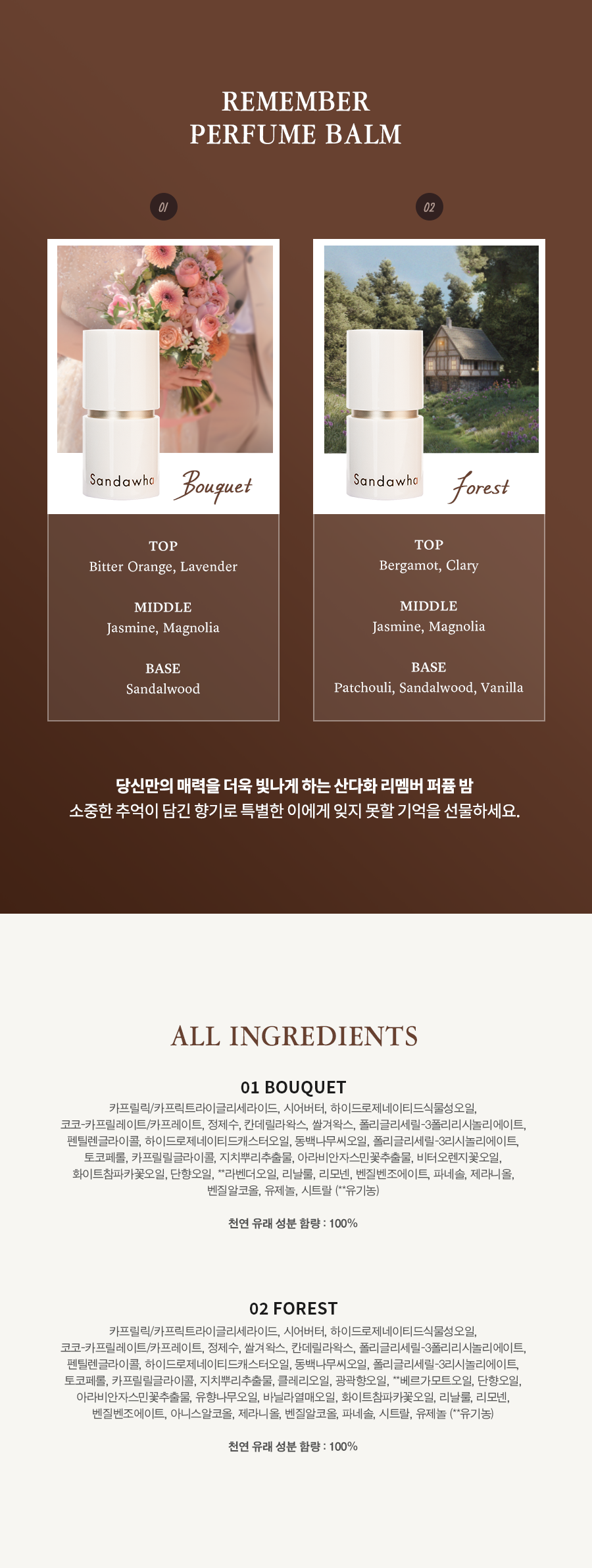 Discover the essence of cherished memories with SANDAWHA Remember Perfume Balm. Crafted with nature’s finest, this COSMOS NATURAL certified solid perfume offers a subtle, long-lasting fragrance experience that nourishes your skin as it delights your senses. Choose between two exquisite scents, BOUQUET and FOREST, each designed to evoke beautiful moments and emotions.