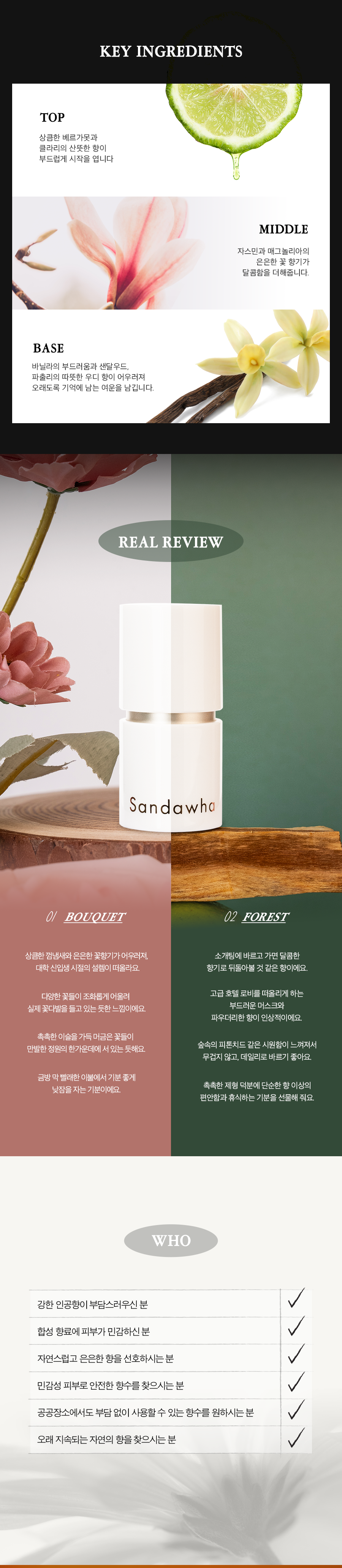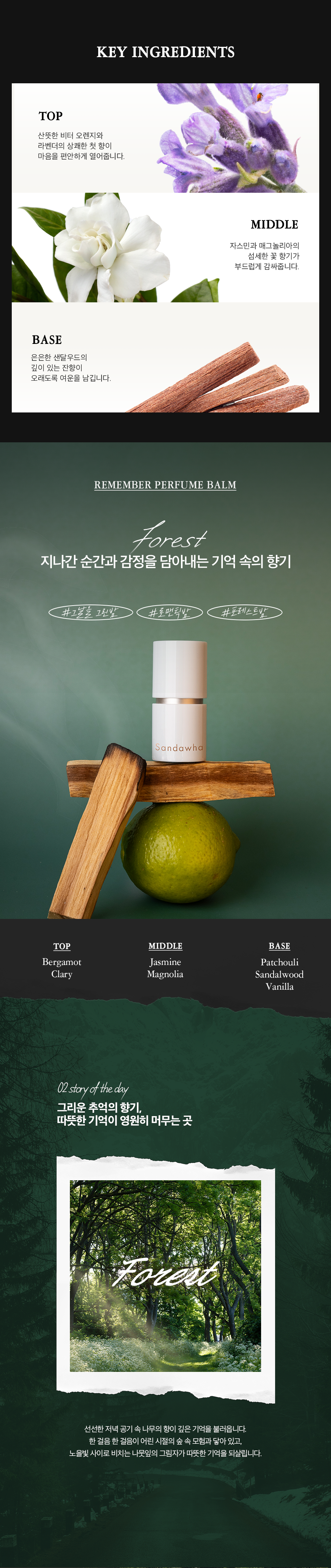 Unlike other perfumes, the sweet and subtle scent of Forest lingers gently for a long time. The deep, woody scent of the forest makes you feel comfortable and stable, offering a healing experience. It’s not a strong scent, but a gentle daily fragrance that makes you feel relaxed and cozy.
