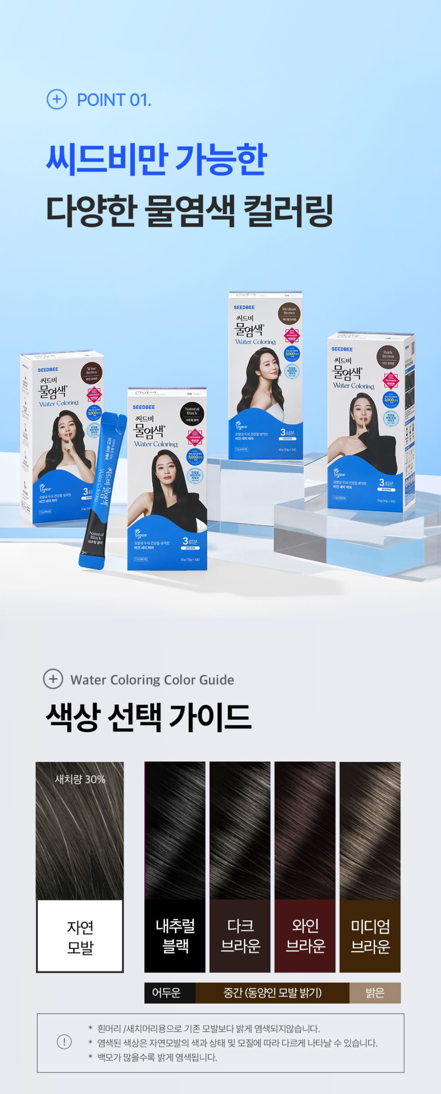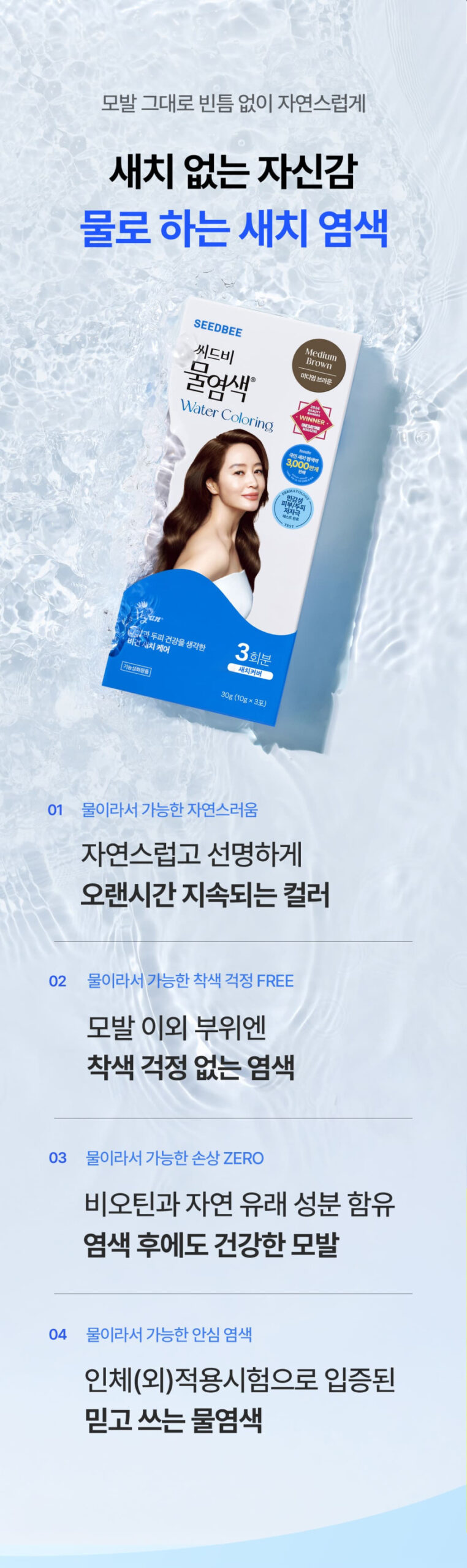 What is Water Coloring™? Water Coloring™ by SEEDBEE is a unique gray hair care solution that uses only water to blend gray hairs naturally. It requires no chemical developers, ensuring minimal hair damage and scalp irritation, allowing for healthy gray hair care even with repeated dyeing.