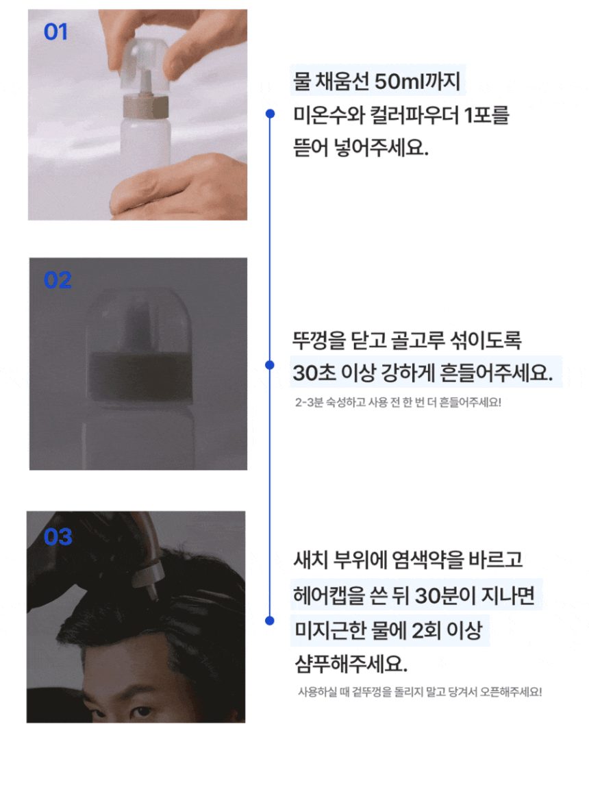 - Open the cap by pulling, not twisting. Apply the dye to areas with gray hair and shampoo with lukewarm water after 30 minutes.