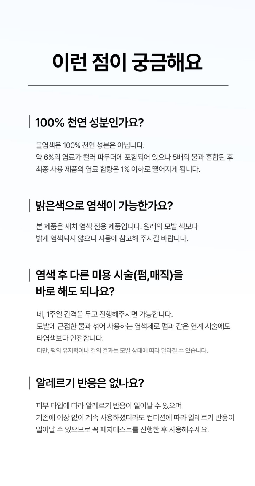 Q5. Does it contain any harmful substances announced by the KFDA? It does not contain any hair dye substances or potentially harmful components that the KFDA has warned against, so you can use it with peace of mind.