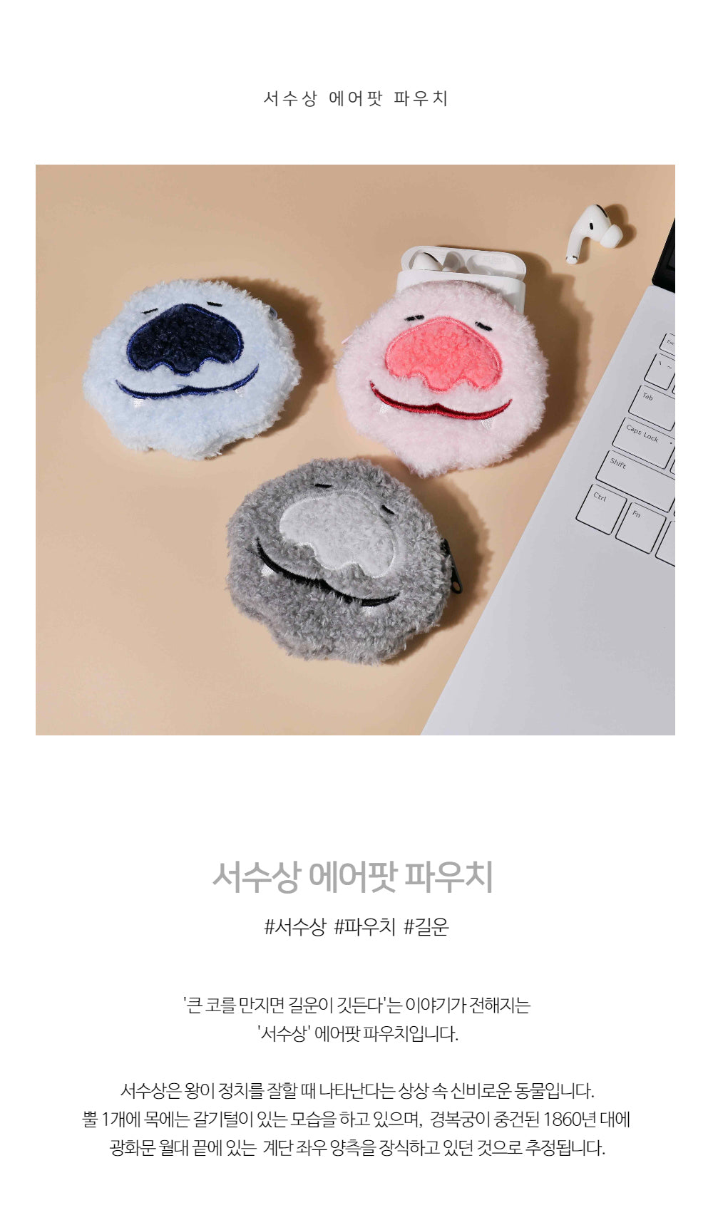 The Seosu-sang AirPods pouch is a unique and meaningful accessory inspired by Seosu-sang, a mythical creature believed to appear when a king governs wisely. This one-horned guardian with a flowing mane was originally used to decorate the staircases of Gwanghwamun Woldae at Gyeongbokgung Palace during the Joseon Dynasty under King Gojong in the 1860s.