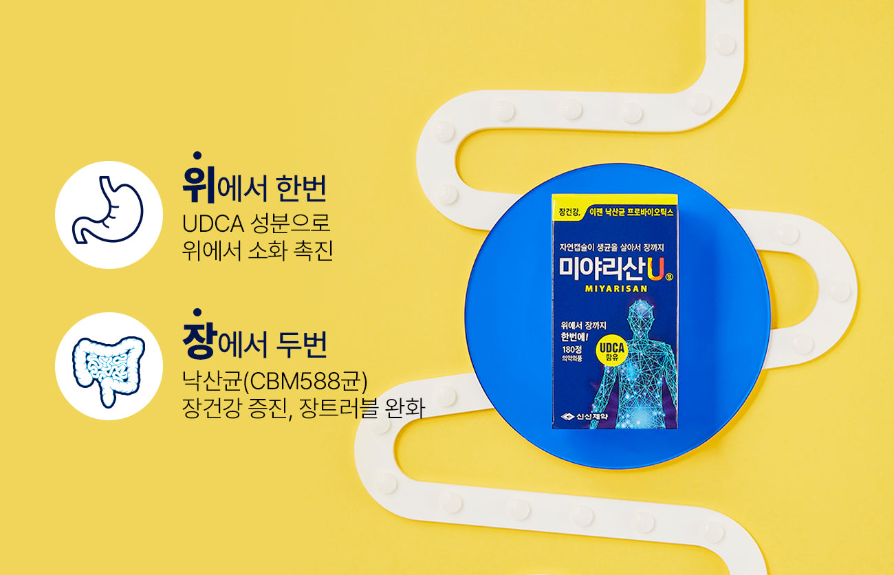 MIYARI SAN U contains UDCA, which promotes bile secretion to improve fat digestion and alleviate discomfort from overeating or indigestion. Additionally, it enhances absorption of fat-soluble vitamins (A, D, E, K).