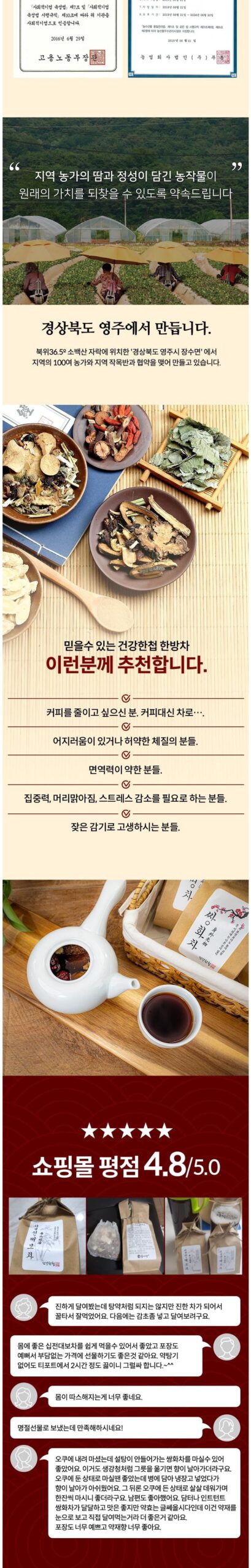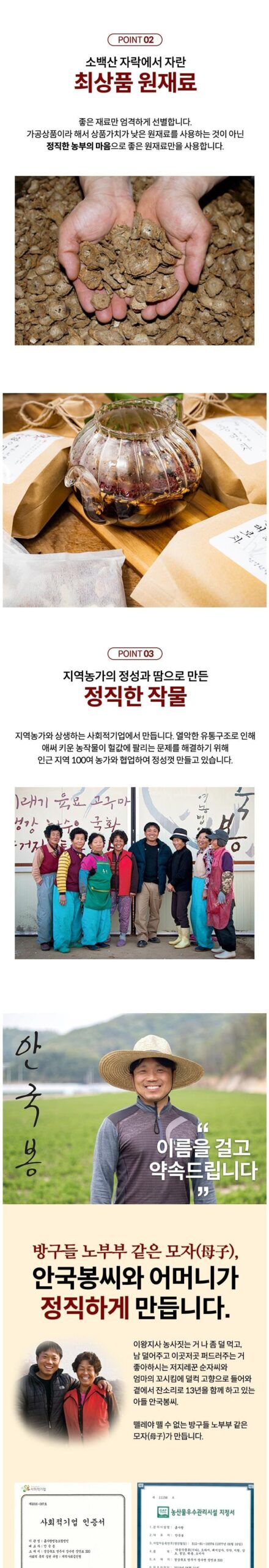 Sourced from Jangsu Village at the foot of Mt. Sobaeksan, this tea is made from crops grown in pristine conditions, benefiting from clean air and the clear waters of Nakdonggam. Each ingredient is cultivated with dedication and care by local farmers.