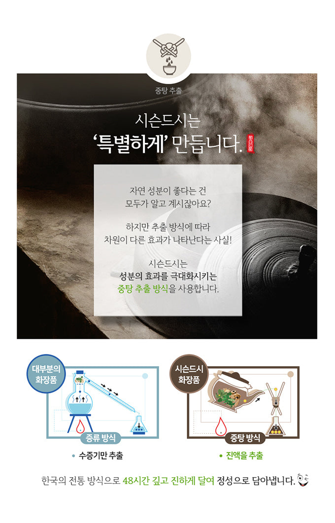 SISEUNDEUSI leverages 30 years of research to perfect the blend of 20 types of wild herbs, optimizing their ratios for maximum skin benefits. These herbs are cultivated using proprietary methods, ensuring quality from the very start.