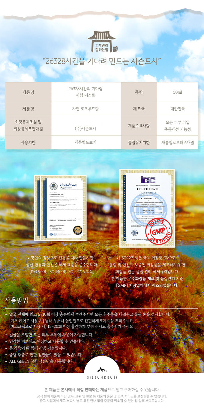 Are you concerned about visible pores, stubborn wrinkles, or lackluster skin tone? SISEUNDEUSI’s Calming Mist is here to address all these issues. Crafted with dedication, this serum mist embodies 26,280 hours of patience and 48 hours of meticulous preparation, making it a true testament to skincare commitment.