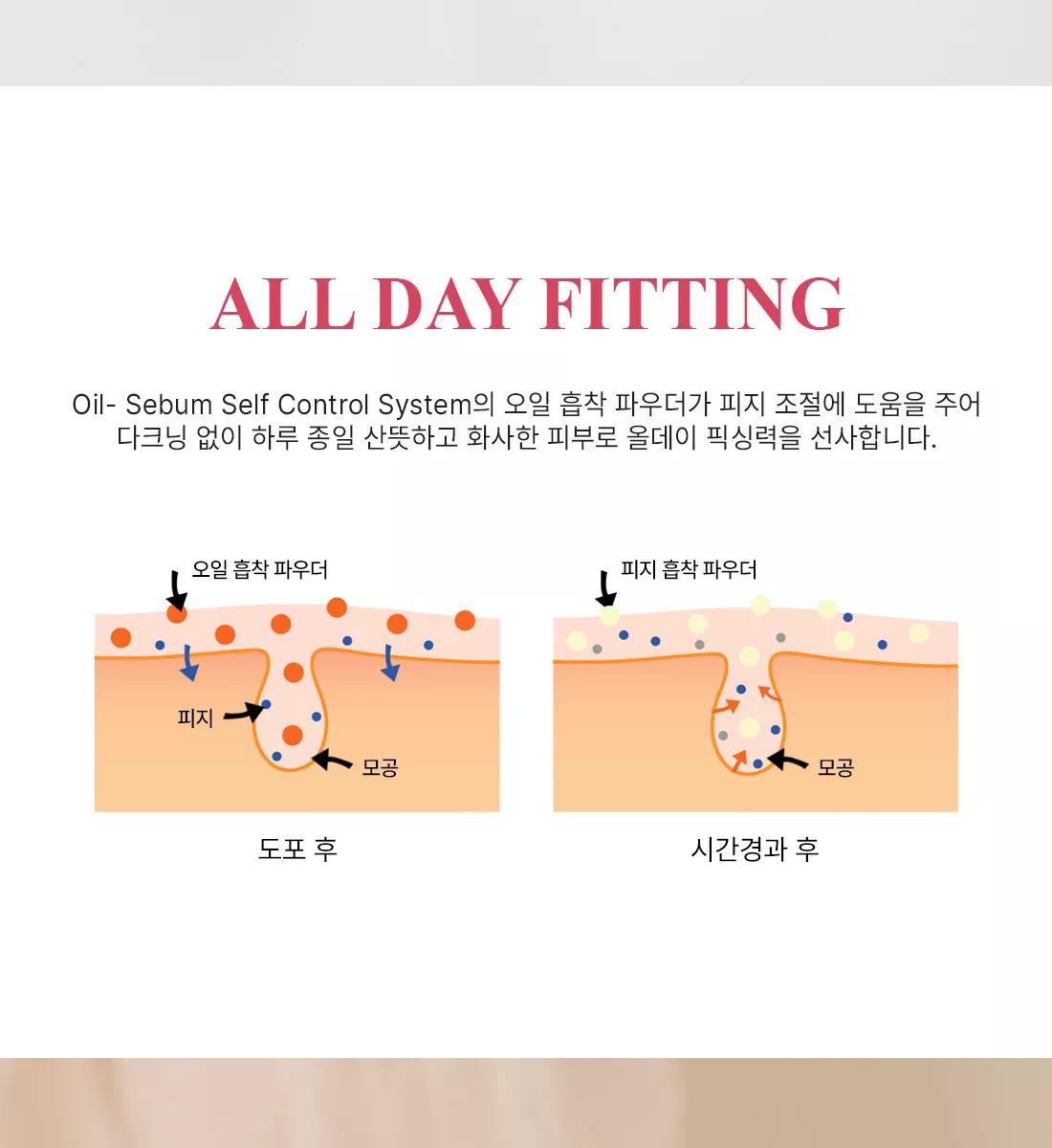 Oil-Sebum Self Control System’s oil adsorption powder helps control sebum, providing all-day fixing power for fresh and bright skin all day long without darkening.